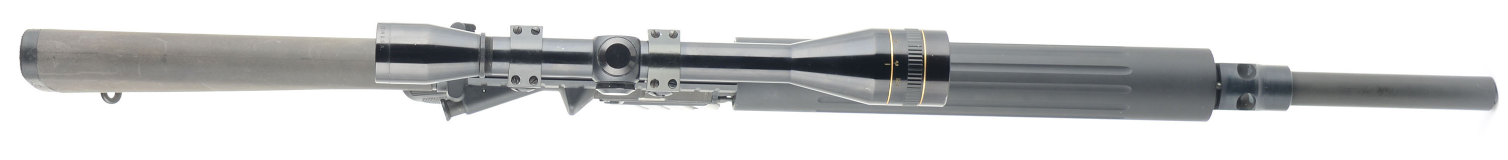 DPMS, A-15, CAL: .223/5.56 (barrel marked .223), MFG: Modern, SN: 11117, Semi Auto Rifle, 20'' barrel. The synthetic checkered grip, composite stock & flued metal forend are all excellent, with handling marks & scuffs. The matte black finish on the upper, lower & barrel rates 95%. The finish on the receiver has a grainy texture & the metal blue finish on the barrel is smooth. Bore is excellent. The rifle is fitted with a Leupold Gold Ring 12x scope. No open sights. Sling loop & stud. Magazine is worn, with brown patina. FFL Req. - Value: 300 to 600