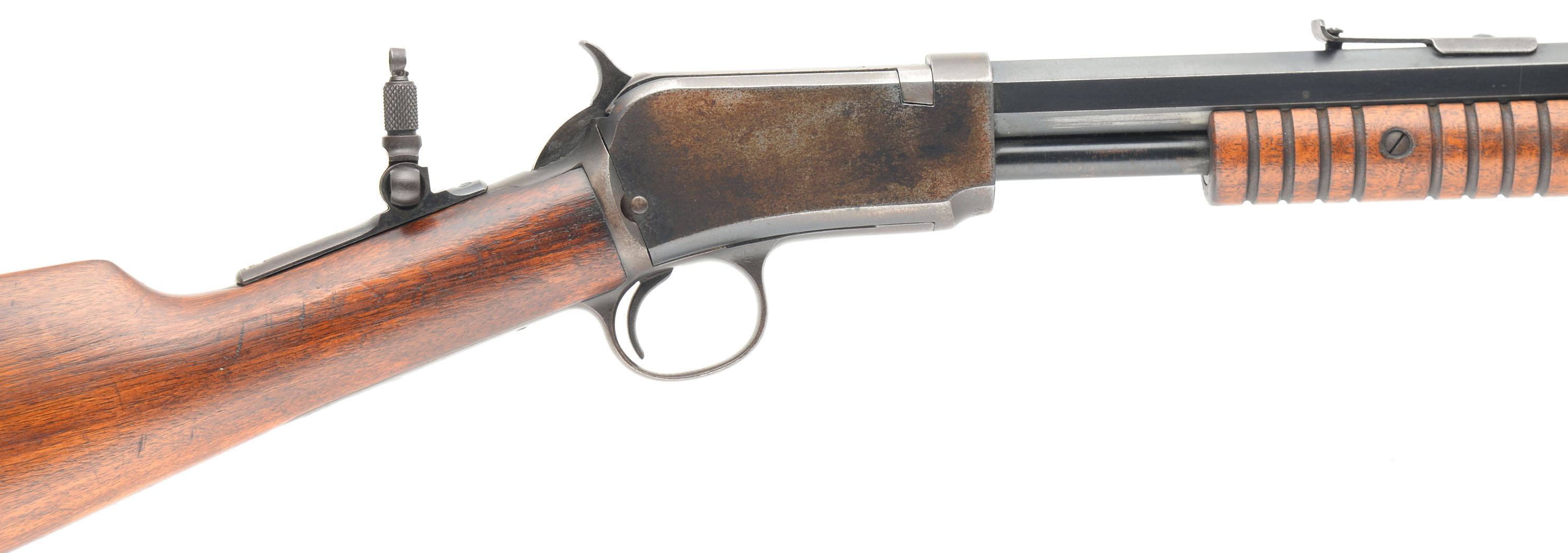 Winchester, Model 90, .22 LONG RIFLE Cal., MFG: 1932 SN: 844619, Slide Action Pump, 24'' Tapered octagon barrel. The L.R, only caliber is the rarest & most desired caliber amongst collectors as only 10% of total production was this caliber. The L.R. caliber was added in the 1890 line-up in 1919. The original wood is excellent, with a few minor finish level handling marks to the original finish. The original metal blued finish rates 85% on the barrel & mag, while the receiver has a thin brown patina & remnants of blue in the more protected areas. Bore is excellent. The receiver carries a Lyman flip-up tang sight, while the barrel carries the original adjustable rear sight & blade front sight, with white bead. Factory crescent steel buttplate, A very nice original example of a single caliber 90. FFL or C&R Req. - Value: 1500 to 2500