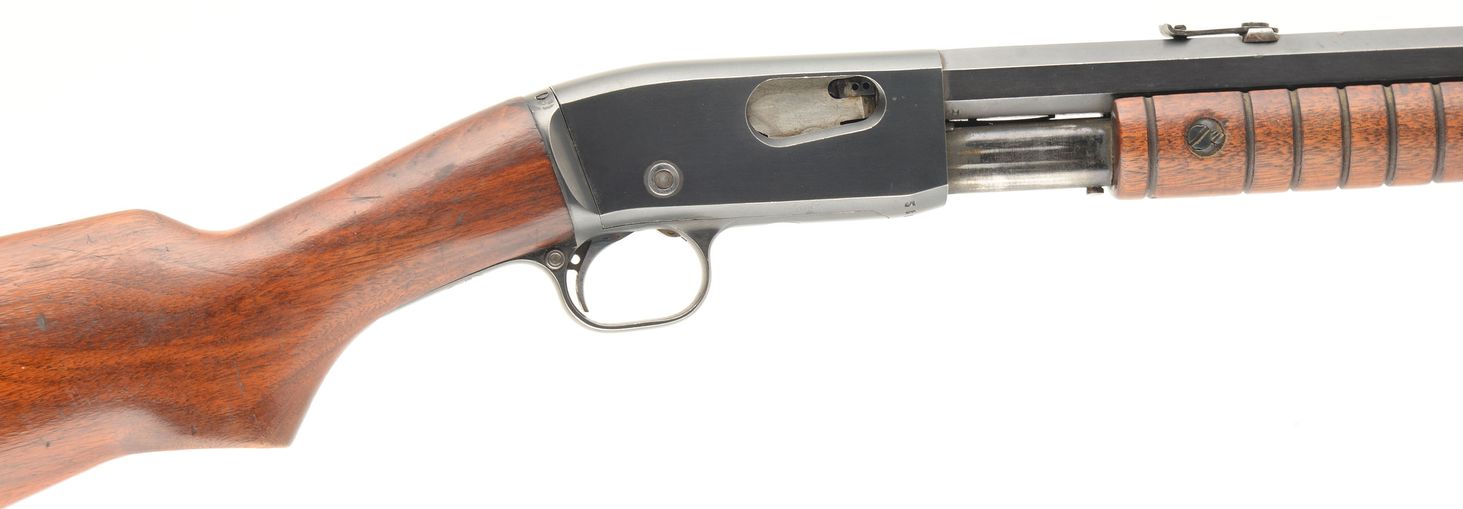 Remington, Model 12CS, .22 REM SPECIAL., MFG. 1909-20, SN: 586773, Pump Rifle, Take-down, 24'' Octagon barrel. The straight grip wood stocks are excellent, with minor to small handling marks, scratches & contusions to the original finish. The original metal blue finish rates 80% overall. The barrel is fitted with standard front & rear sights. Bore is excellent. Original crescent metal buttplate. FFL or C&R Req. - Value: 400 to 800