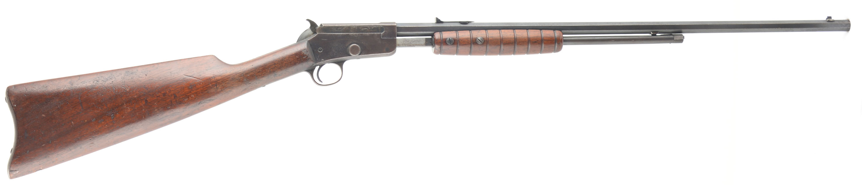 Marlin, Model 20, .22 S. L. & LR. Cal., MFG: 1906-22, SN: NVS, Pump Rifle, 22'' Octagon barrel, 2/3rd Tubular mag. Take-down. The original straight grip wood stocks are very good & solid, with numerous minor to small contusions, scratches & scrapes to the wood & original finish, which is thinning from use. The factory metal blue finish rates 70% on the barrel, while the receiver & mag tube have good coverage of an even brown patina. Barrel is mounted with an adjustable rear & blade front sights. Bore is good, with some cleaned pitting & roughness amongst solid rifling. The stock carries the original smooth curved metal buttplate. Rifle action function smooth & properly. A nice looking original example. FFL or C&R Req. - Value: 300 to 600