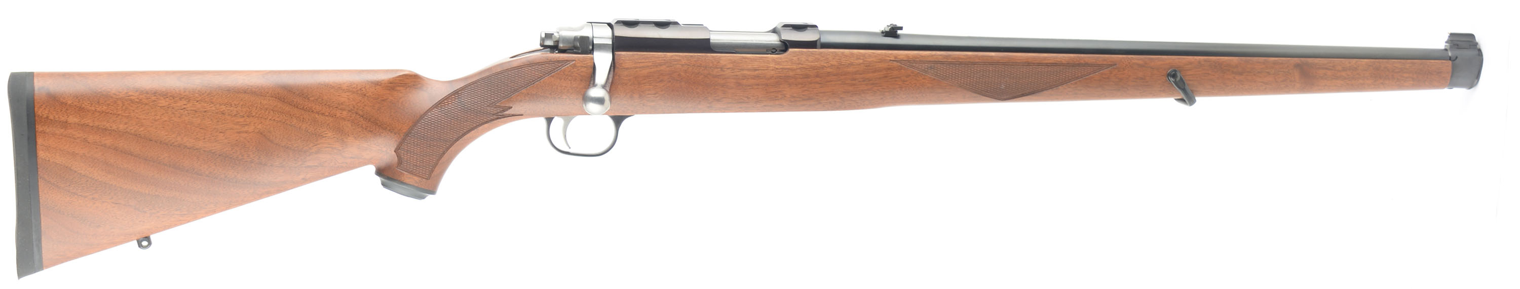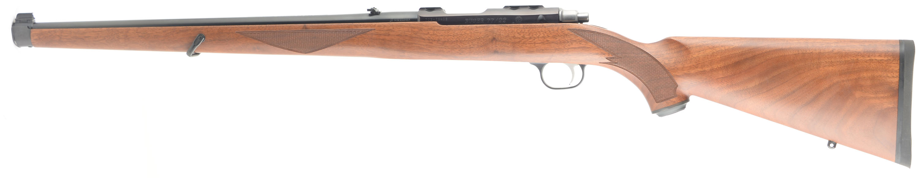Ruger, Model 77/22, CAL: 22 WIN MAG., MFG: 2014, SN: 703-75408, Bolt Action Rifle, 18.5'' barrel. The original checkered & Ruger logo capped pistol grip Mannlicher style walnut stock is excellent, with virtually no handling marks to the original excellent finish. The original metal blue finish rates 99% overall, with the receiver toning the typical Ruger plum. Bore is excellent. The receiver has integral scope mounts machined directly into the solid steel receiver, while the barrel carries a folding leaf rear & factory front sights. Buttstock carries a Ruger logo solid rubber recoil pad. Sling studs. Factory detachable mag. Excellent overall. FFL Req. - Value: 600 to 800