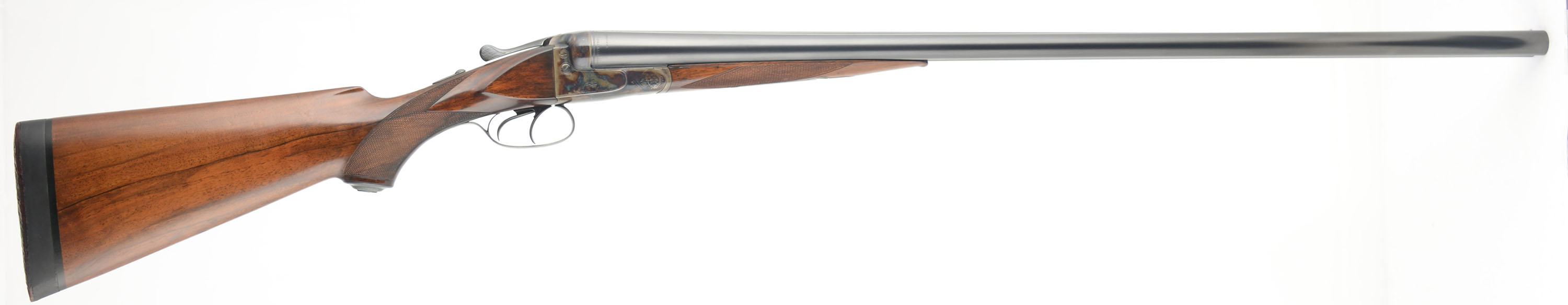 JP Sauer & Sohn, SxS Shotgun, CAL: 12GA, MFG: 1920's, SN: 215487, Break Action, 29 3/4'' barrels. This gun has been fully & professionally restored by R.L. Mathens in 1940's. The original stocks are excellent. They feature checkering, an engraved metal grip cap & beaded cheek. There are only minor handling marks to the applied finish. There is a dowel fill in the belly of the stock from a sling stud provision & there are two filled screw holes in the bottom rib for sling loop. The metal blue finish on the barrels rates 98%, with cleaned pitting underneath the re-blued finish. The case-hardened receiver & forend release lever have excellent, vivid case-colors. Bores are excellent, with minor wear from use. The solid matted rib holds a single front bead. Stock has a solid black rubber recoil pad with an aged leather butt end. Dual triggers. Mechanically excellent. A very nicely restored German shotgun. LOP: 14 3/4'' overpad to front trigger. FFL or C&R Req. - Value: 1000 to 2000