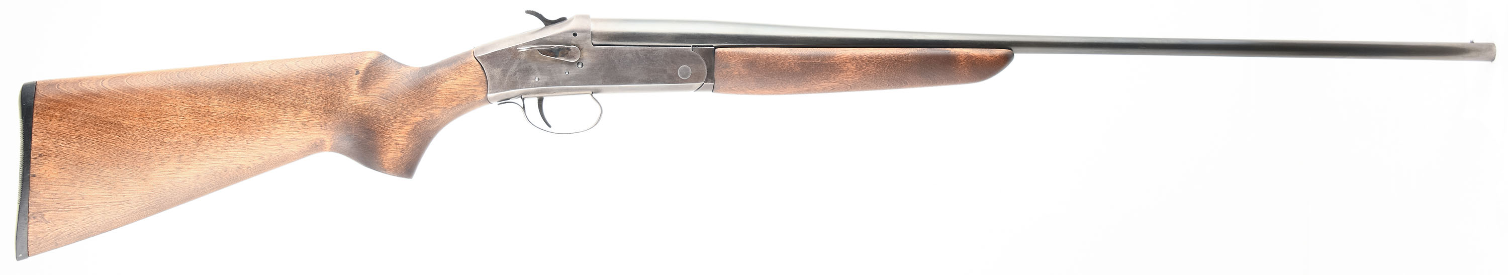 J.C. Higgins, Sears, Roebuck And Co., Model 101.40, CAL: 410 GA 3'', MFG: 1946-60, SN: None, Tip Up Single Shot Shotgun, Choke: Mod, 25 3/4'' Barrel. The wood stock and forend are very good, near excellent, solid with a couple of very small dings and scratches. High handling wear areas on the wood have darkened. The receiver has worn to a gun metal grey with light, even, speckled patina. The barrel has worn to a mix of gun metal grey and thin original blue with some areas being toned to a light brown patina. Bore is excellent, bright and smooth. Mechanically solid, seems to function well. The barrel holds a front bead sight, there is a rear sight notch cut into the top of the receiver. The stock has a serrated plastic buttplate. LOP is 14''. FFL or C&R Req. - Value: 150 to 300
