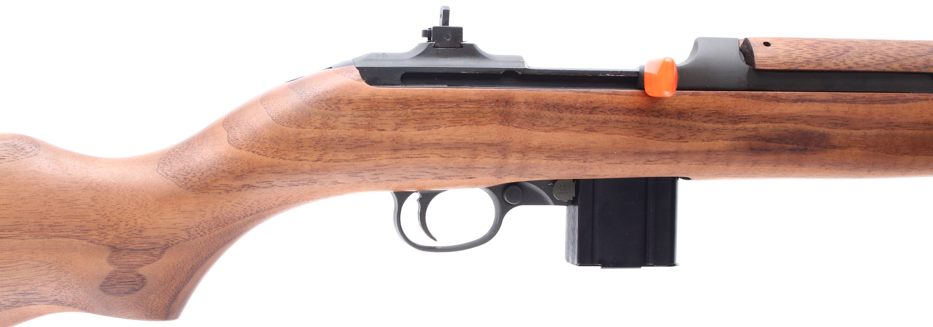 BOXED, Auto-Ordnance (Kahr Arms), Model: M1 Carbine, Cal: .30 Carbine, MFG: Modern S/N: MB2592, Semi-auto rifle, 18'' barrel. The semi-pistol grip American Walnut stock is Excellent near MINT with little to no visible wear. Black parkerized metal finish rates 99% overall with minimal wear from operation & firing. The receiver band is marked ''U.S. CARBINE'', ''CAL .30 ML''. The left side of the receiver is marked with the S/N. the rear of the receiver is marked ''AUTO-ORDNANCE'', ''WORCHESTER, MA.''. The bore is excellent. Bright & shiny with little no visible wear. The barrel holds a blade front sight with protective wings. The rear of the receiver holds L-leaf flip up aperture rear sight. The stock carries a steel buttplate with black paint finish. Rifle has the front, left side sling mount. Cutout in stock for oiler bottle to be used as rear sling mount, no oiler bottle in the stock. Rifle comes with the FACTORY box, gun lock, one 10 Rd. mag, owners manual & other associated paperwork. A beautiful modern production M1 carbine. FFL or C&R Req. - Value: 700 to 1400