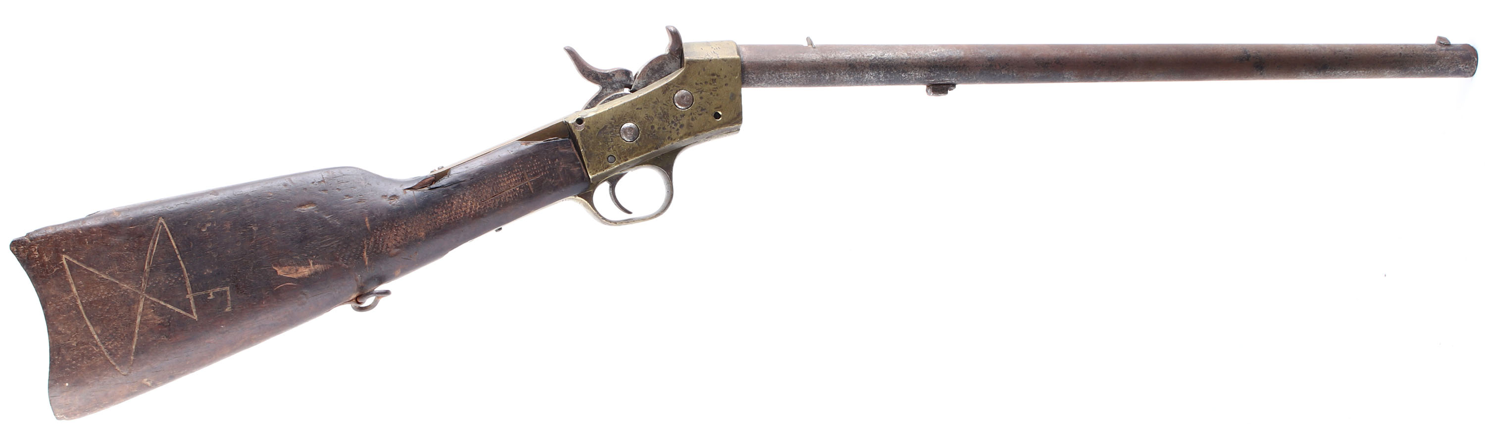 CONDITION: The straight wrist buttstock is fair to poor. Has cracks, chips, scratches, vice marks, dings, & wear from use/age. Missing forend. The barrel has toned to a mixture of gun metal gray & brown patina. the Brass frame has patina & numerus nick & ding marks. Crack in the rear top screw hole on the right side of the receiver along the top of the frame. Frame missing the forward receiver tang. Breech block is stuck forward, does have some play but wont mechanically open. Hammer is seized, does have some play but wont lock back. Forend/barrel lug is loose. The receiver band is marked ''N.L.P.''. The bore is Poor. Dark with pitting. The barrel holds a barleycorn front sight with a fixed U-notch rear. Buttstock has no buttplate. The rifle has a rear sling mount, loop is bent. This rifle is being sold AS IS with NO RETURNES ACCEPTED. Antique, No FFL Req - Value: 100 to 600