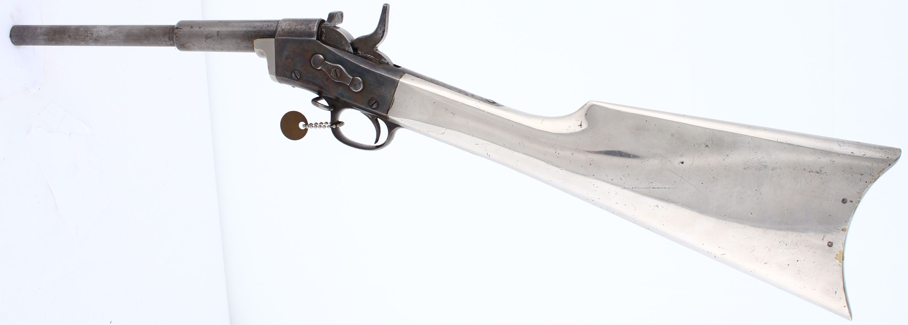 CONDITION: the straight wrist, nickel plated solid brass buttstock is very good, has some scratches & dings as well as some nickel flacking/chipping & pealing around the butt end corners & corners of the wrist. The buttstock retains about 96% of its nickel finish. The right side of the wrist is marked with the patent dates ''DEC.8.1885'', ''SEPT.7.1886''. The case-hardened finish on the receiver retains about 75% coverage with common wear spots thinned/toning to a brown patina. receiver has a light speckling of surface rust. The barrel is bare steel & has a rust/patina speckling. The left side of the receiver is marked ''REMINGTON ARMS CO. ILLION N.Y.''. The bore is very good. bright &* shiny with a couple spots of roughness. Rifle comes with two of the sleeve projectiles. Stock has no buttplate. A unique & rare collectors piece with a interesting use. Antique, No FFL Req - Value: 5000 to 10000