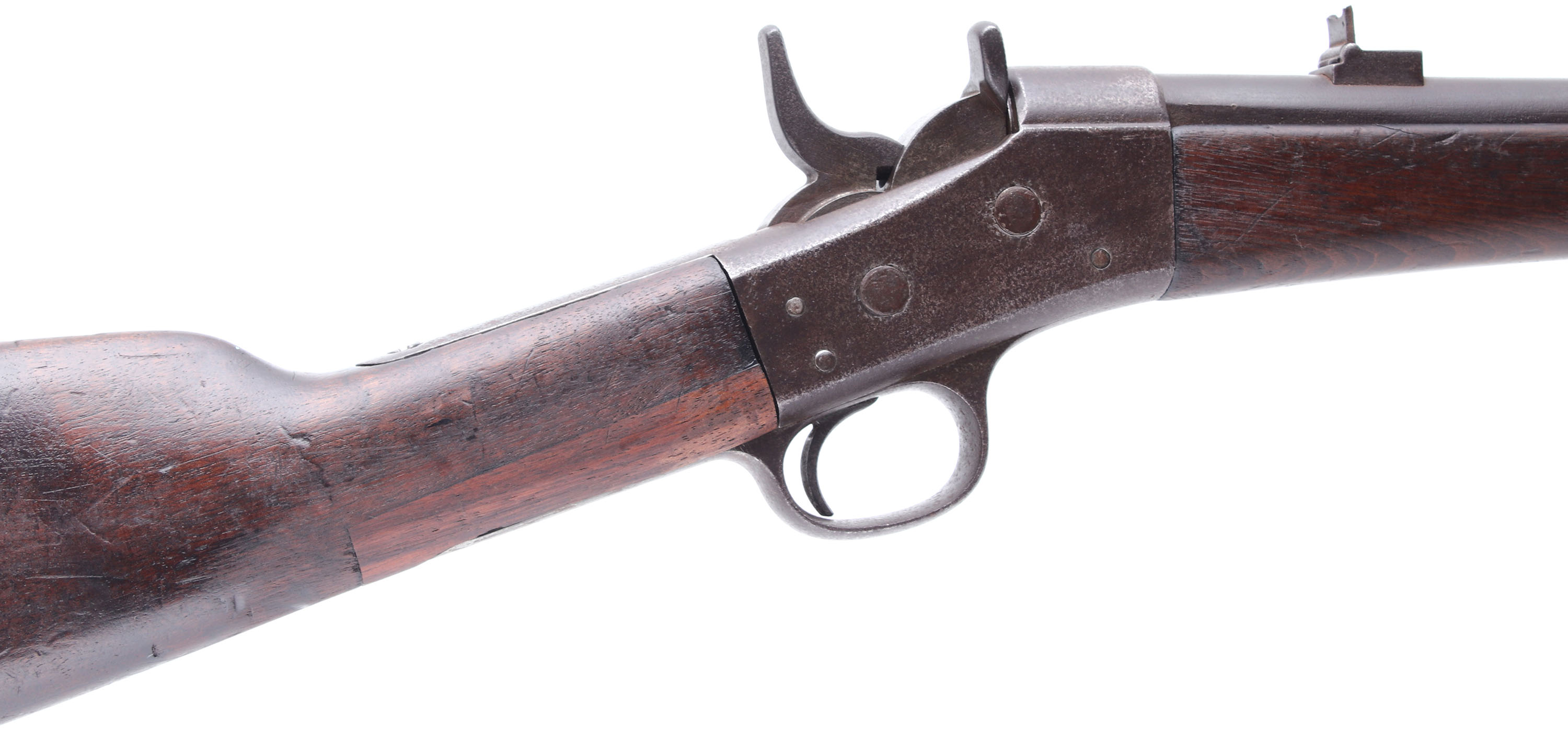 CONDITION: the two-piece wood stock is good as having a large wood fill repair on the wrist, repair is tight & appears to be arsenal done. There is a 1 1/2'' crack on the left side of the wrist, & two more cracks around the tip of the forend. The metal has toned to a mix of dark brown patina & gun metal gray. Roughness/cleaned pitting across most of the receiver, more on the barrel but not as deep. The receiver tang is marked with the ''E. REMINGTON & SONS'' three-line address ending in ''1874'', marking is partial obscured/worn off from roughness & wear. The top of the chamber is marked ''E.N.'', stands for ''Ejercito Nacional'' (National Army). A small ''F'' & the assembly number ''71837'' marked on the left upper & lower tangs of the action. The bore is good. Its bright with some spots of roughness. The barrel holds a barleycorn front sight with a L-leaf flip up V-notch rear sight. The stock carries a steel buttplate, tones brown with roughness & light dings. Rifle has a left side receiver mounted sling ring. Antique, No FFL Req - Value: 700 to 1400