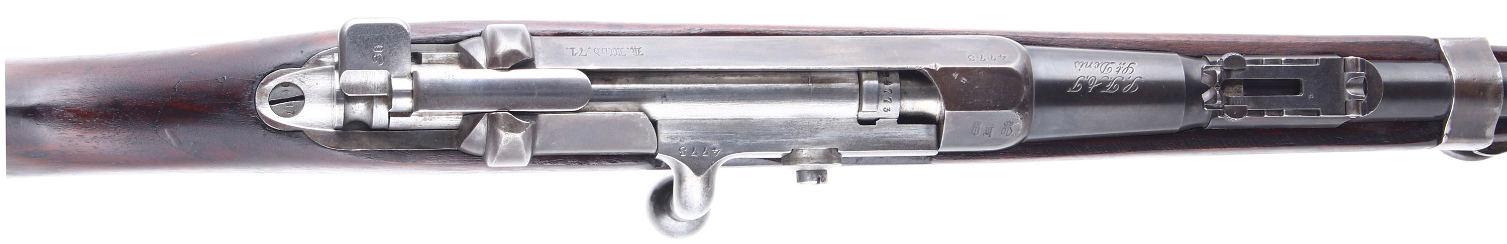 CONDITION: The straight wrist wood stock is very good as having a wrist break repair & being lightly sanded & refinish because of the break. The wrist repair is tight & has four wooden dowel reinforcement. One small chip repair on the stock/receiver bolt escutcheon, on the bottom of the stock. The stock also has a couple wood fill repairs dotted around the stock. The repairs & re-finish job is professional & appears to have been done in a arsenal, likely when it was converted at St. Denis. Light oil staining around buttplate. the bottom of the stock has two worn ''3'' stamps, one just in front of the trigger guard tang, one just behind. The blued metal finish on the barrel rates 94% with some spots of light thinning, mostly around chamber. The receiver was left in the white (unfinished) when it was made, but was blued at St. Denis when it was converted. The blued metal finish on the receiver rates 70% with thinning & spots toning to a brown patina. The left side of the receiver is marked with the S/N, ''K.Mod.71.''. Right side of the receiver is marked with three Imperial German, crown over letter proofs, ''1884''. The top of the barrel is marked ''L.F.t.P'', ''St. Denis''. S/N matching bolt, all other parts are mismatched. The bore is excellent. Bright & shiny with little to no visible wear. The barrel holds a barleycorn front sight with a stepped base/ladder V-notch rear sight. Base marked 2 to 10, ladder marked 12 to 20. The stock carries a bare steel buttplate, has brown patina speckling. Rifle has bottom sling loop & forward sling ring. Rifle has brass tip cleaning rod. A nice handy carbine with a unique story & mix of markings. Antique, no FFL Req. - Value: 800 to 1600