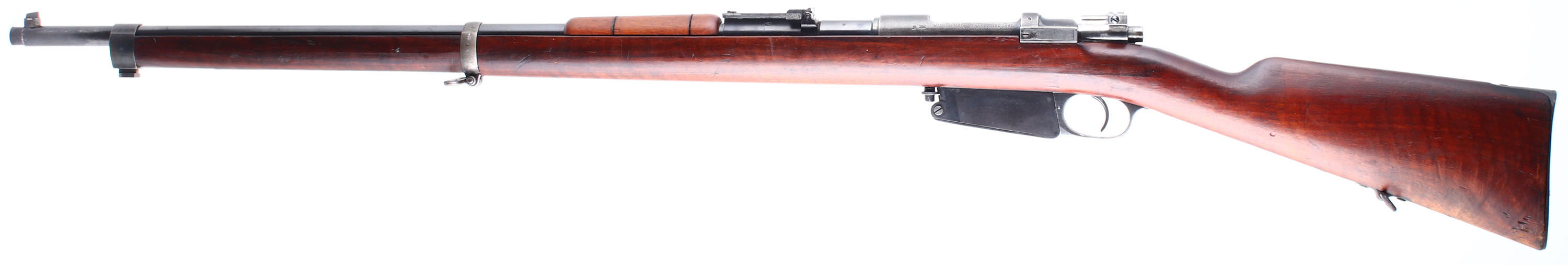 Deutsche Waffen-Und Munitionsfabriken (DWM), M1891 Argentino Mauser, Cal: 7.65x53mm Mauser, MFG: Late 1899, S/N: T 6665, Bolt action rifle, 29'' barrel. The straight wrist walnut stock is very good with minor nicks & dings from use/age. More small gouges ate the toe & light oil staining around the buttplate & rear sling base. A Mismatched S/N (K0050) is stamped into the right flat of the stock just in front of the magazine. Slightly worn acceptance roundel cartouches on right cheek of stock. There is one star over ''RA'' in a circle cartouche on the upper handguard, two more smaller cartouches on the bottom of the wrist, three ''AG'' in shield cartouches on the belly of the stock in front of the rear sling base, & another star over ''RA'' in a circle cartouche by the toe. The blued metal finish rates 90% on the barrel with spots of wear/thinning, & 25% on the receiver, mostly worn gun metal gray with blue in protected areas. The top of the receiver band has the faint remnants of the Argentine coat of arms. The left side of the receiver is marked with two proof stamps, ''MAUSER MODELO ARGENTINO 1891'', ''DEUTSCHE WAFFEN-UND'', ''MUNITIONSFABRIKEN.'', ''BERLIN''. The right side of the receiver band is stamped with the S/N. The barrel shank is marked with two proof stamps & the S/N ''M8250''. Other metal parts have small proofs. S/N mismatched bolt, barrel & magazine. The bolt has grind marks & is stiff when cycling, rifle should be looked at by a gunsmith before firing. The bore is excellent near MINT. Bright & mirrorlike with no visible wear. The barrel holds a barleycorn front sight with a flip-up ladder, V-notch rear sight marked 4 to 20. The stock carries a blued steel buttplate has wear, brown patina, & roughness/pitting scars under the finish. Rifle has both bottom sling loops. Rifle has no cleaning rod. Most Argentine Mauser have the crests ground off because it was a legal requirement to export them when the majority of them were imported. This requirement was gotten rid of later but since they imported the rifles in better condition first the ones in worse condition usually have them, & there are far fewer of them. With the problems with the bolt on this rifle it should be inspected by a gunsmith before firing, & is being SOLD AS IS with NO RETURNS ACCEPTED. FFL or C&R Req. - Value: 250 to 500