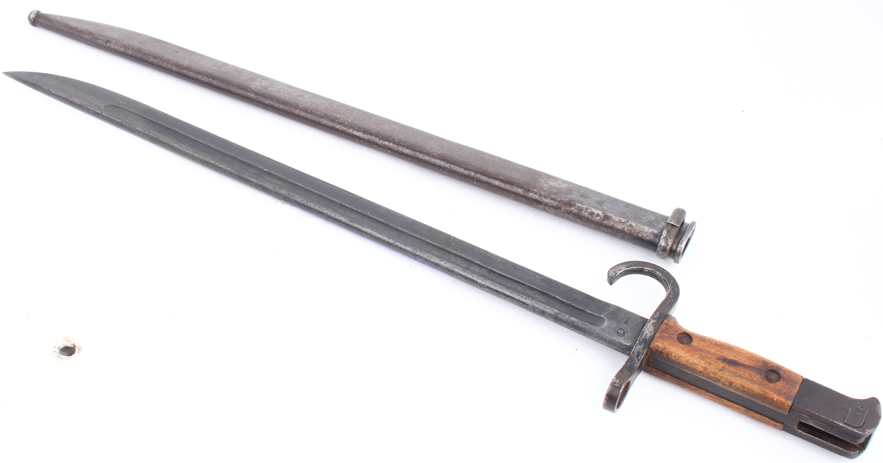 Kokura Arsenal (Japan), Model: Type 38, Cal: 6.5x50mmSR, MFG: 1935-38, S/N: 39843 (23rd series). Bolt action rifle, 31 1/2'' barrel. The semi-pistol grip wood stock is good with numerus nicks, dings, dents, & scratches from use/age. The right side of the stock, just above the trigger has a 1 crack emanating from the upper receiver tang. Next to the crack is a small wood fill repair. Another wood fill repair on the bottom of the stock, between the barrel bands. The two-piece buttstock is normal for Japanese rifles of this era, this was done to make the stocks stronger, easier to repair, & made better use of the wood to make the stock. Bottom of the wrist & the belly of the stock each have one Japanese cartouche. The metal carries a arsenal re-blue that rates 90% on the receiver & 95% on the barrel, with spots of thinned finish toning brown, speckled light rust, & spots of roughness/light pitting around the stock line. Grinding marks on the top of receiver where the Chrysanthemum was are toned brown. There is some roughness/cleaned pitting under the finish from the re-blue job. Some markings on the rifle are slightly faded from the re-blue job. The left side of the receiver is marked with the series mark, S/N, the Kokura Arsenal logo, & one small inspectors stamp. The top of the receiver is marked ''TYPE 38'' in Japanese, & has grinding marks where the Chrysanthemum was taken off. S/N matching bolt & dust cover. The bore is good. Its beginning to darken, with light roughness & thinned rifling. The barrel holds a barleycorn front sight with protective ears, & a flip up ladder, V-notch rear sight marked 4 to 24. The stock carries a steel buttplate, toned chocolate brown with roughness/pitting scars. Rifle has both bottom sling loops, missing the cleaning rod, & comes with a RARE original S/N matching dust cover. Rifle also comes with a Type 30 bayonet with sheath, made by National Denki under Kokura supervision, has hooked quillon. The vast majority of dust covers for the Arisaka's were ditched when they were surrendered as they would rattle if it wasn't fit to the rifle, the reason they have a S/N. There was no effort made to match the right bolts & dust covers to the right rifles when they were taken as souvenirs, so they were tossed. Almost every Arisaka left the factory with a dust cover during the pre, early, & mid war times, this was abandoned on the later last ditch rifles. Rifle appears to mechanically function fine. FFL or C&R Req - Value: 300 to 600