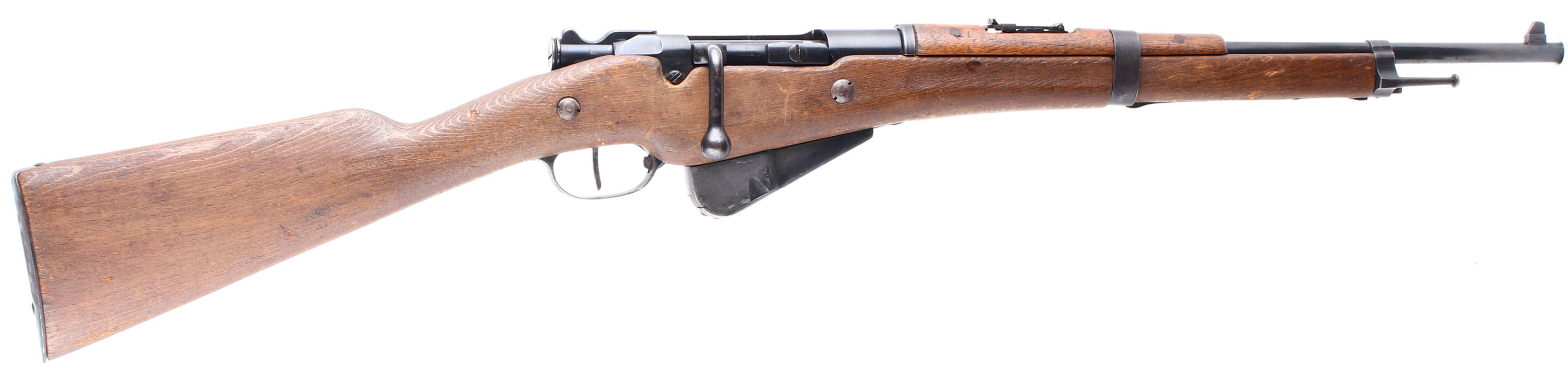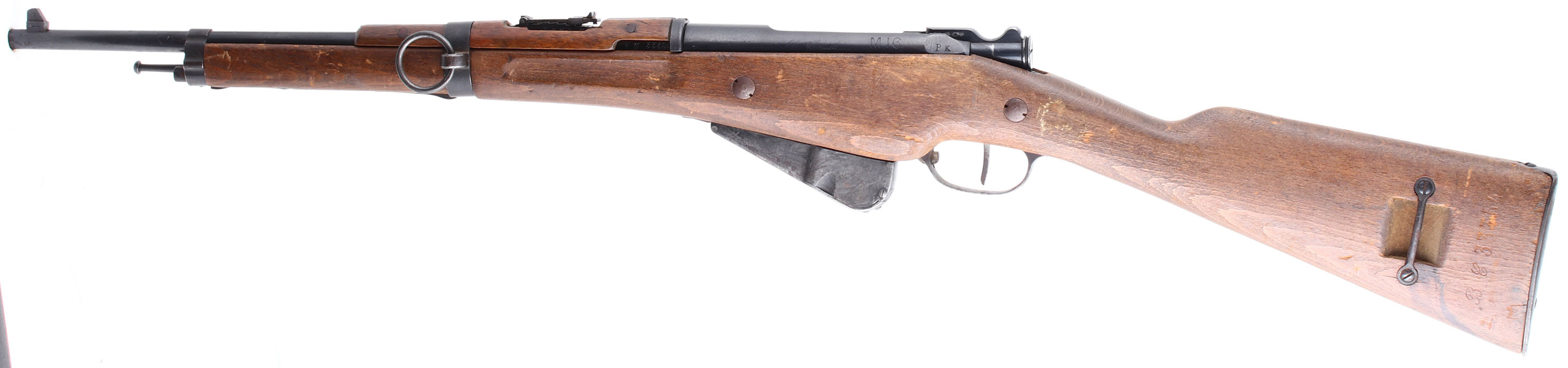 HISTORY: The Berthier was designed as a replacement for the aging single shot black powder Gras rifle that was being used by Mounted security forces, cavalry units, artillery units, & in colonial service. The French had the Lebel in the new smokeless 8mm round, but it had a tube magazine that ran the length of the barrel, therefore cutting them down created a problem with capacity. The new rifle was designed by Andre Virgile Paul Marie Berthier, a French civilian engineer in the Algerian railways. It used a three shot Mannlicher end-bloc clip, greatly increasing reload speed, particular convenience for cavalry and other mounted troops. The Lebel had to be single loaded instead of loading all at once, giving the Berthier a faster fire rate over the whole length of a battle, even though the Lebel held eight Rds., while the Berthier held three. The smaller capacity was chosen over the typical five rounds after field testing, where the cavalry expressed a preference for a non-protruding magazine that did not interfere with the balance or handling of the rifle. It was adopted on March 12, 1890 & designated the MLE 1890. The cavalry loved the carbine, & another version would be made specially for the Artillery troops which added a bayonet lug & changed the forend of the stock, this would be the MLE 1892. The MLE 1892 would be made clear to 1917, until production of its upgrade the MLE 1916 could start in May of 1917. The MLE 1916 added a five shot magazine & a handguard from the many complaints of use with front line troops. Production of both the 1890 calvary & 1892 Artillery would stop & the MLE 1916 Mousqueton would replace both. Older models would also be updated with the newer parts once they got sent back to a arsenal for repair, leading to rifles with a mix of parts & markings. The MLE 1892/M16 carbines were the only model of Berthier produced after WW1 with all other being discontinued, it would made till 1938. This gun is Ball N marked. This means it was modified to use the new Ball N cartridge. This new cartridge was tailored to long range, heavy machine guns having a heavier bullet & more powder. This results in more chamber pressure & the chambers of older rifles had to be modified to safely fire this new cartridge. The cartridge was developed in 1932 & all older weapons still French inventory from 1934 to 1939 were modified to the ball N chamber & marked ''N'' on the barrel or receiver. Firing Ball N ammo out of a non ''N'' marked gun is unsafe & shouldn't be done. A ball N marked gun is safe to fire N & Non-N 8mm Lebel out of.