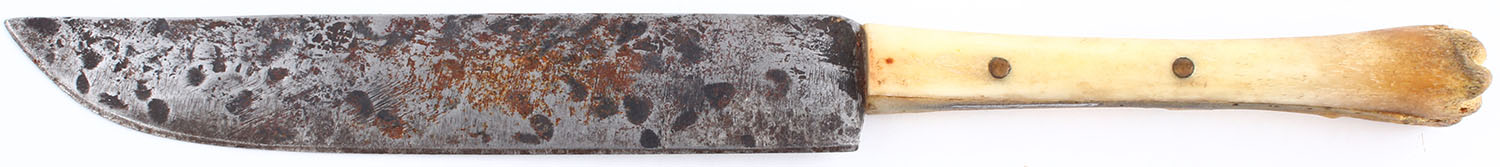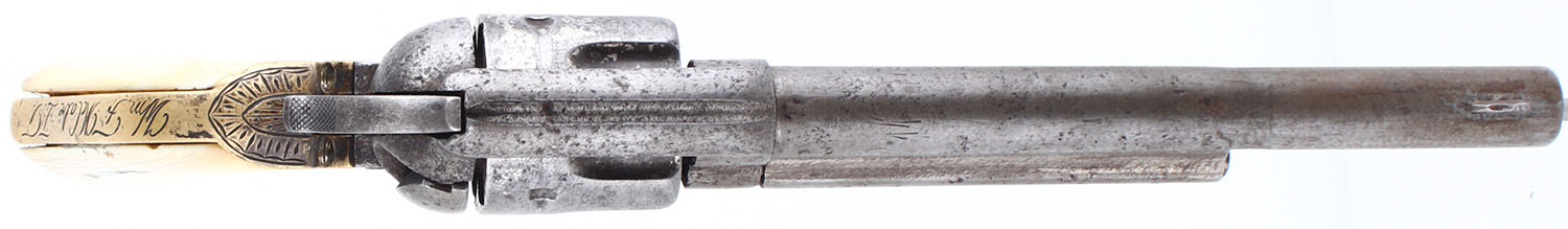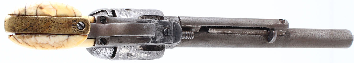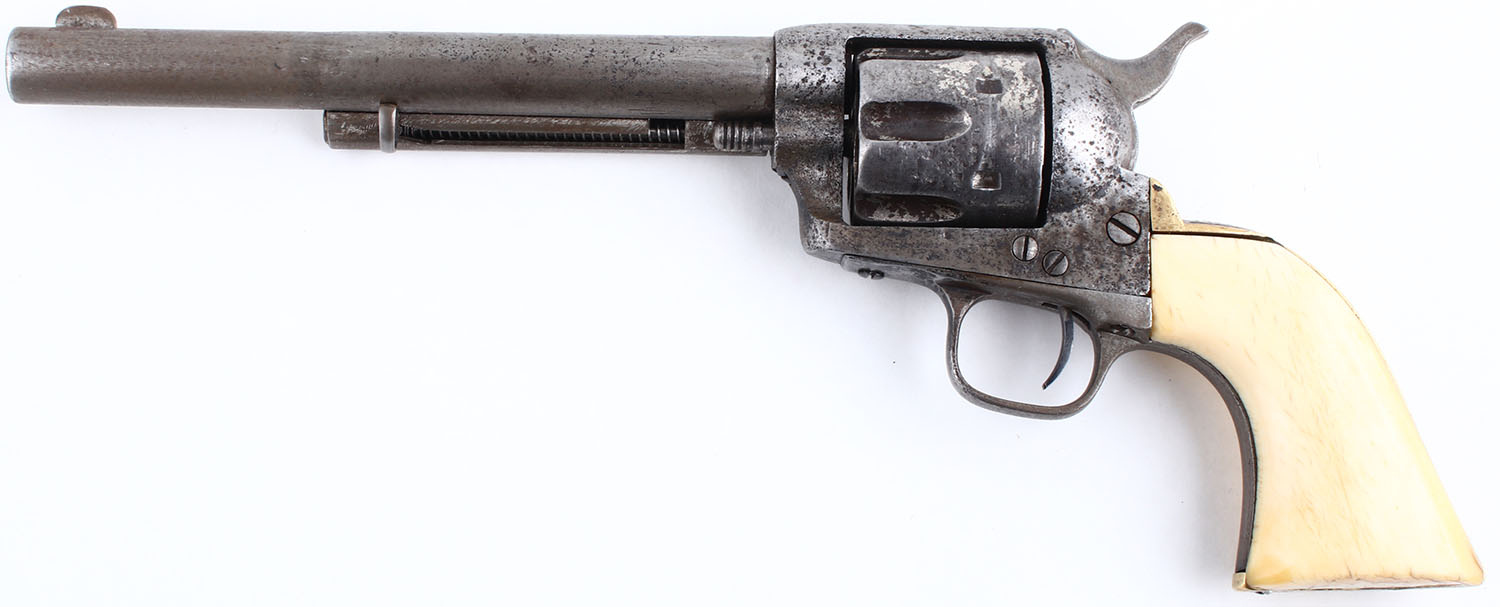 CONDITION: The authentic ivory grips are very good & solid. The grain pattern & difference in tones are appealing. There are some minor edge chips. The original nickel finish has fully worn to gun metal gray, with remnants of original nickel finish remaining on the cylinder, in protected areas. The bottom of the barrel, just in front of the cylinder pin is marked ''44'', no other visible barrel markings. The patent stampings on the left side of the frame is worn but still partially visible. There is spotting & pitting throughout the metal surfaces & a barrel ring 2 3/4'' from the muzzle. The bore is poor, dark & worn. Integral v-notch rear sight & blade front sight. Mechanical operation appears to function properly, but the action has play & the components appear to be worn from use. The normal four cylinder clicks are reduced to two. This revolver is accompanied by an 1880's beaded belt, with white, red, yellow & blue beads. The belt holds a beaded holster, beaded pouch, painted knife sheath & a small metal badge marked ''DEPT OF PUBLIC SAFETY TEXAS RANGERS'' with a Texas Star in the middle. The beaded holster has a Texas Star with arrows, ''5'' & a snake?. The knife sheath holds a 6'' blade, with bone handle. Blade condition is fair. A unique set, with accoutrements. The frontier Six shooter came out in 1877 in .44-40 rather than .45 Colt. This was done to have ammo interchangeability with the popular 1873 Winchester to boost sales. This pistol has a black powder frame which uses a set screw to lock the cylinder pin & not a push button. It was introduced in 1892, but was not fully implemented until 1896 with old frames & parts being used up. Antique, No FFL Req - Value: 2500 to 4500