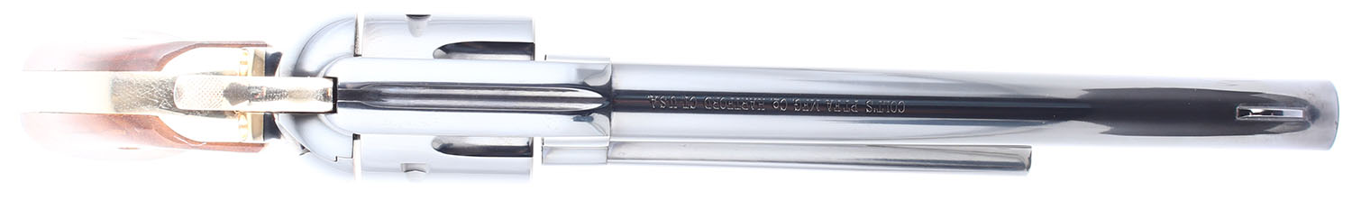 CASED Colt, Single Action Army, CAL: 45 Colt, MFG: 1961, SN: 4619AM, Single Action Revolver. 7 1/2'' barrel. The Colt medallion wood grips are in excellent condition. The blued finish rates 98% with some rust in less visible areas such as under the hammer and behind the cylinder. There are some splotches that have worn down and toned to a mix of gun metal grey and brown patina, most notably on the loading gate and at the end of the ejector housing. The brass frame is in excellent condition. The side of the barrel is marked -125th ANNIVERSARY - S.A.A. MODEL .45 CAL. -. Bore is excellent. Mechanically very solid, the cylinder has very little side to side and back and forth play. Front blade sight is integral to the barrel, rear sight trough is cut into the top of the frame. Comes in a red felt lined wooden case with a 125th anniversary commemorative medallion. FFL or C&R Req. - Value: 1200 to 2400