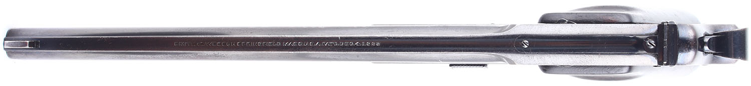 CASED Smith & Wesson, Straight Line Target, CAL: 22LR, MFG: 1925-36 SN: 390, Single Shot. 10'' barrel. The wood grips are in very good condition with light handling wear, there seems to be a thick matte finish on them that has darkened substantially. The blued finish rates 50% with substantial handling wear and patina. Bore is excellent. Mechanically solid. Rudimentary sights, front blade sight is pinned to the barrel, rear sight is set in a cut on the barrel. Comes in a green fabric lined metal case with a cleaning rod and a screwdriver. FFL or C&R Req. - Value: 800 to 1600