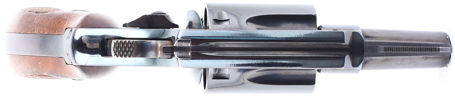 Smith & Wesson, Model 36, CAL: 38 SPL. MFG: Modern. SN: 7J848, Double Action Revolver. 1 7/8'' barrel. The checkered wood grips with S&W medallion are in good condition with some handling wear and dings, the right grip panel is chipped near the top where it meets the frame. Part of the grips have been stained black by the retention strap of the leather holster. The factory blued finish rates 99% with very light handling wear. The case hardening on the trigger and hammer is excellent. Bore is excellent. Mechanically solid, the cylinder has very little side to side & back & forth play, the hammer & trigger mechanism functions very well. Rudimentary sights, serrated front ramp sight is integral to the barrel, rear sight trough is cut into the frame. Comes in a generic black leather holster. FFL Req. - Value: 400 to 800