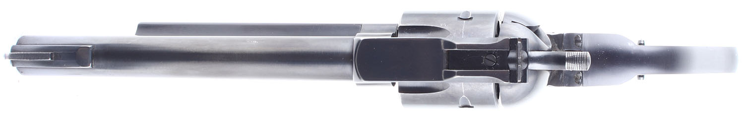 Ruger, Blackhawk, CAL: 357 MAG. MFG: 1968. SN: 123603, Single Action Revolver. 6 3/8 barrel. No grips. The bluing rates 98% with some handling wear. There are some dings and scratches on the bottom and backstrap of the grip frame as well as the trigger guard. The loading gate has begun to tone a plumb patina. Bore is excellent. Mechanically solid, the cylinder has some side to side & back & forth play. Blacked out target sights, serrated front ramp sight is integral to the barrel, windage and elevation adjustable rear sight is pinned into a cut on the top of the frame. FFL or C&R Req. - Value: 400 to 800