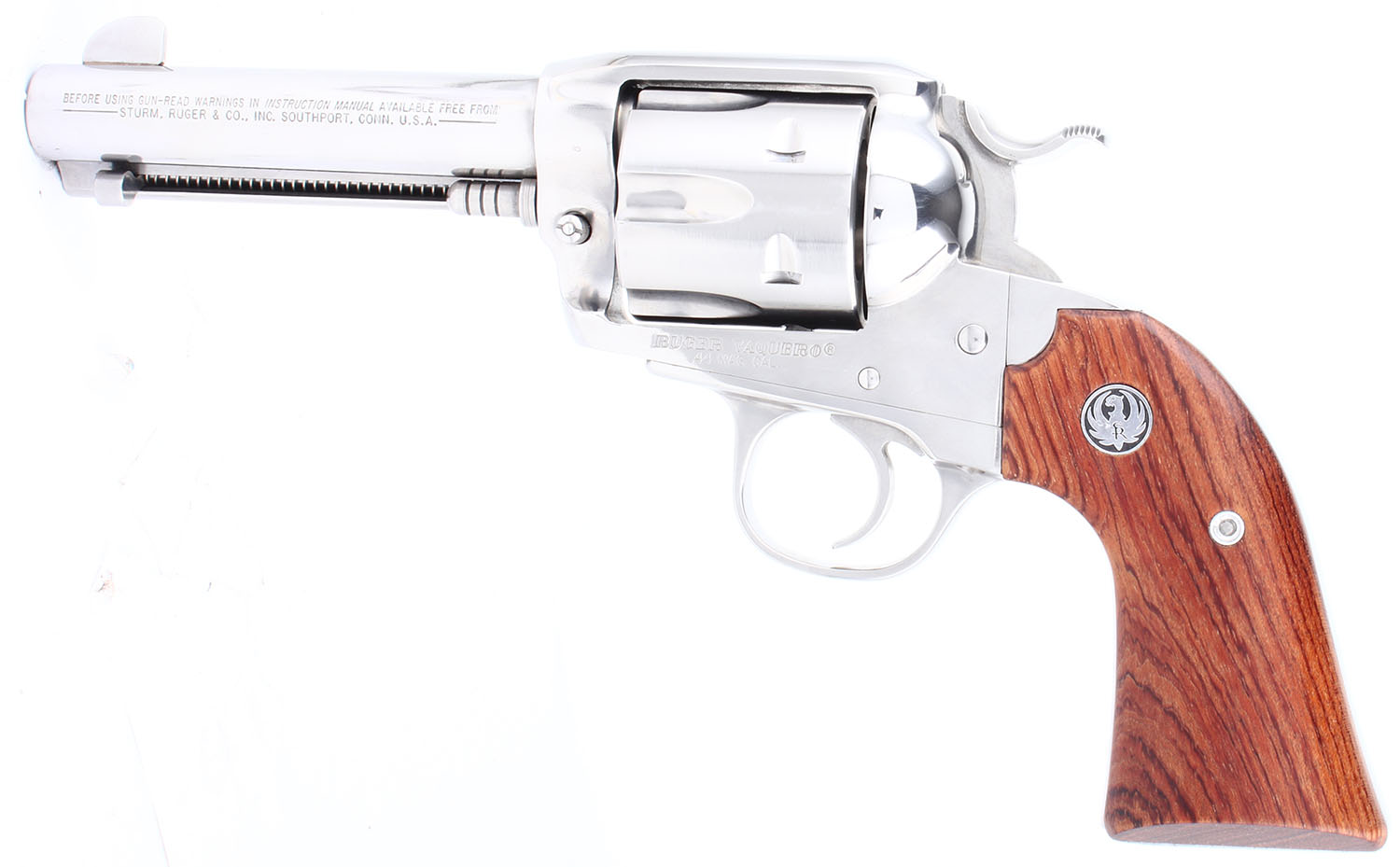 CASED Ruger, Vaquero, CAL: 44 MAG. MFG: 2001. SN: 58-02361, Single Action Revolver. 4 1/2 barrel. The factory wood grips with Ruger medallions are excellent with very light handling wear. The factory nickeled finish is excellent with very light wear. Bore is excellent. Mechanically solid, the cylinder has some side to side & back & forth play. Rudimentary sights, serrated front blade sight is integral to the barrel, rear trough sight is cut into the frame. Comes in the serially matched factory Ruger hard case with an owners manual and other related paperwork. FFL Req. - Value: 550 to 1100