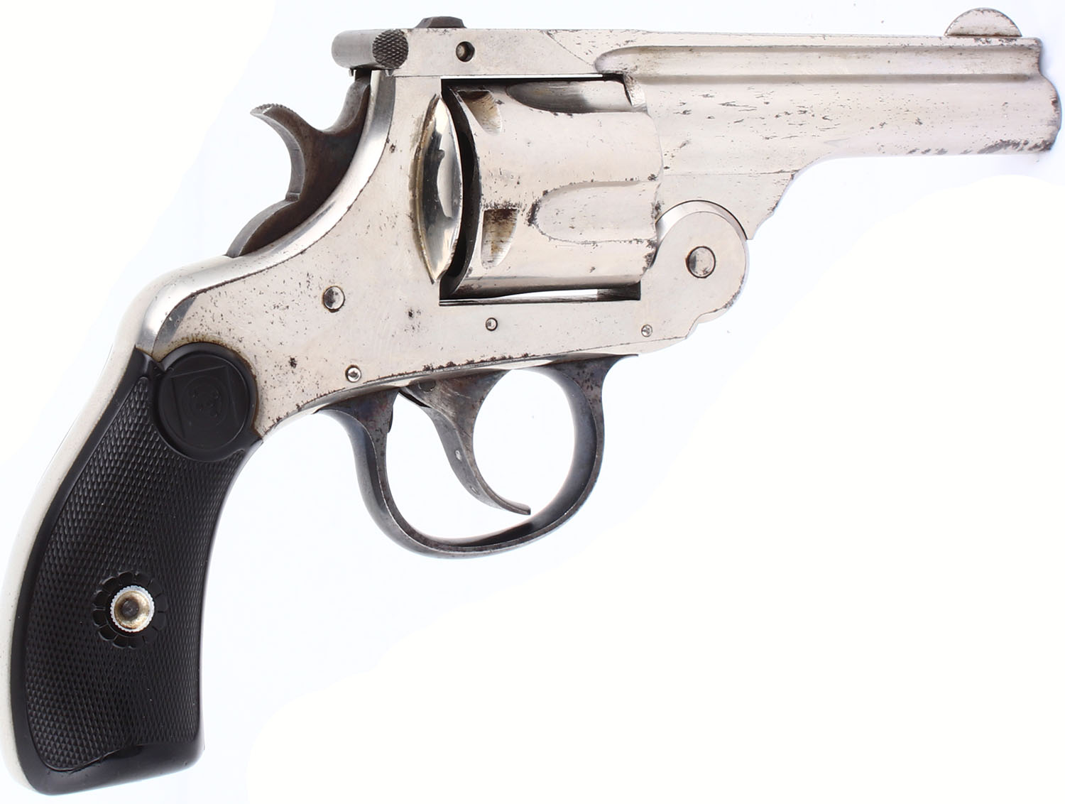 Harrington & Richardson, Auto Ejector Second Model Fifth Variation, CAL: 38 S&W, MFG: 1897-1908. SN: T56095, Double Action Revolver, 3 1/8'' barrel. The checkered rubber grips are in good condition with light handling wear, some age soiling, and a crack on the bottom of the left grip panel. The nickeled finish on the gun is in good condition with some wear and rust speckling. Bore is very good, the rifling is strong but slightly darkened with light even roughness and very light pitting. Mechanically solid, the cylinder has substantial side to side & back & forth play. Rudimentary sights, front blade sight is affixed to the barrel, rear sight is integral to the barrel latch. FFL or C&R Req. - Value: 100 to 200