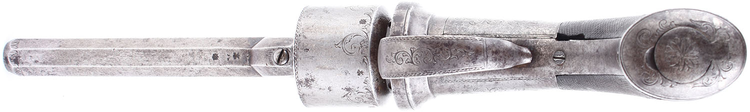Unknown Maker (British), Transition Revolver (Probably a Converted Pepperbox), CAL: 38 Cap and Ball, MFG: Circa 1820-60. SN: 957, Double/Single Action Percussion Revolver, 5 1/4'' barrel. The checkered wood grips are in fair condition, they have darkened substantially and have a large chip out of the corner of the right grip. The grips look good but have substantial cracks on the inside that jeopardize their structural integrity. The finish has worn and toned to a thin brown patina over gun metal grey. There are scroll engravings all around the gun that are intact and beautiful. Bore is poor, the rifling is defined but thin and dark with substantial roughness and pitting. Mechanically solid, seems to function well, the cylinder does have some play. Front bead sight is threaded into the barrel. Antique, no FFL Req - Value: 600 to 1200