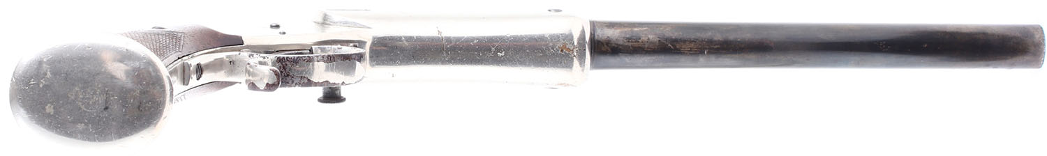J. Stevens & Co., Model 36 LORD Pistol CAL: .22 (Probably Short), MFG: 1884-98. SN: 444, Single Shot, 10'' barrel. The wood grips are in excellent condition with some handling wear. The bluing on the barrel rates 82% with some patina and gun metal grey. Bore is very good, the rifling is thin but very bright with very light roughness. Mechanically solid, seems to function well. Buckhorn sights, rear buckhorn sight and front post sight are set in dovetail cuts on the barrel. Antique, no FFL Req. - Value: 800 to 1600