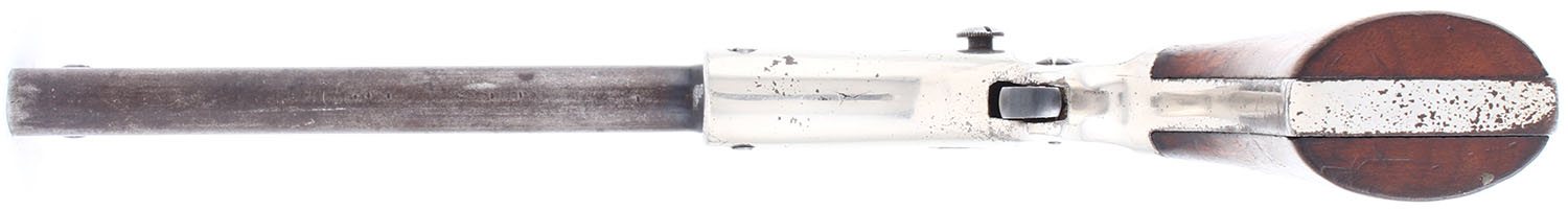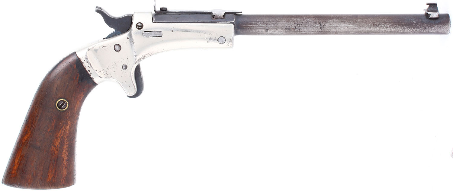 J. Stevens A&T Co., Model 43 Diamond Second Issue, CAL: 22 LR, MFG: 1896-1916. SN: 28116, Single Shot, 5 7/8'' barrel. The wood grips are in very good condition with some handling wear, and minor dings. The bluing on the barrel has worn thin and toned to a mix of brown patina and original blue with some exposed gun metal grey. Bore is good, the rifling thin and slightly darkened with even roughness and light pitting. Mechanically good, the hammer and trigger mechanism seems to work well. The barrel does get stiff when opened all the way and requires a little bit of force to start closing, likely just needs to be cleaned. Buckhorn sights, rear buckhorn sight and front post sight are set in dovetail cuts on the barrel. FFL or C&R Req. - Value: 200 to 600