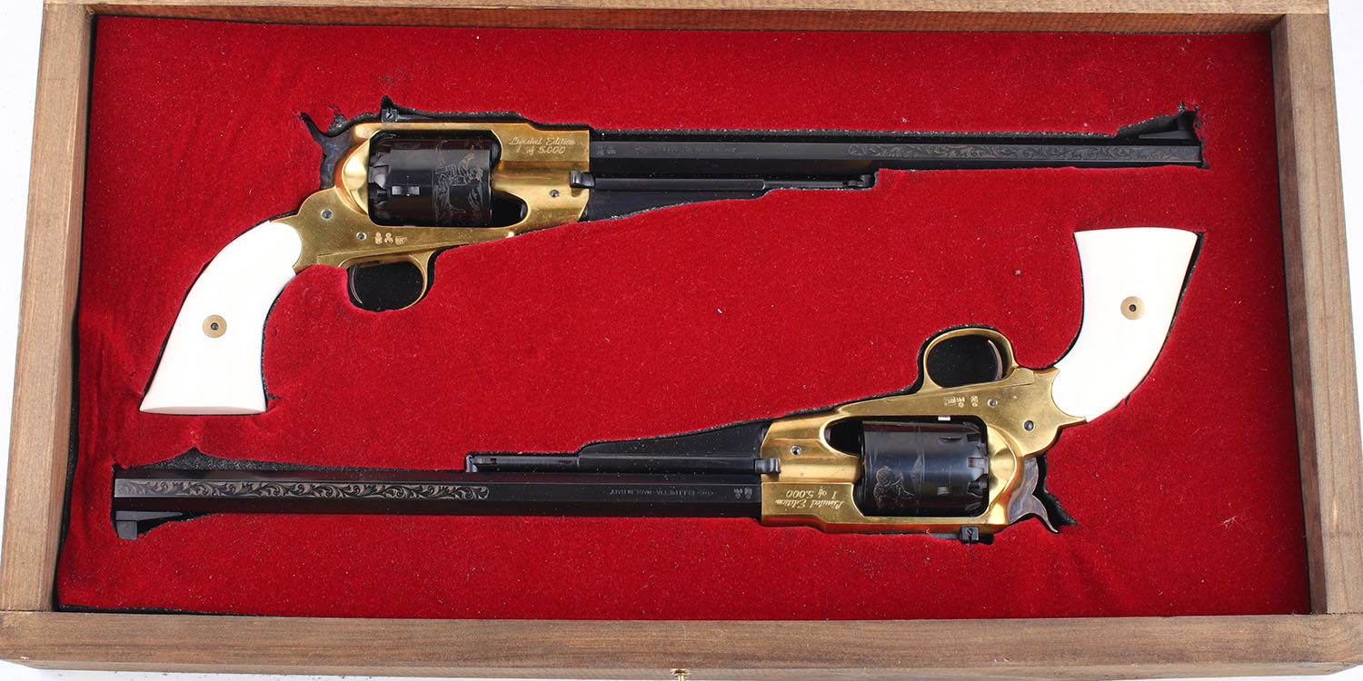 CASED SET, F.LLI Pietta, 1858 Buffalo Revolvers Limited Edition 1 of 5000, CAL: 44, MFG: Modern, SN: TSG1466/TSG1465, Percussion Muzzleloader Pistols, 12'' barrels. Both revolvers are perfectly matching. The grades that follow are for both revolvers. The faux ivory grips are excellent. The metal blue finish on the barrel & cylinder rates 99%. The barrel has 6'' of floral scroll engraving on both sides & the cylinders have a buffalo & gunman scene. The polished brass frames are excellent. The case-hardened hammers are excellent. Bores are excellent. Adjustable rear sight & tall blade front sight. Marked ''LIMITED EDITION 1 OF 5000''. Mechanically excellent. Both revolvers come in a factory wood presentation case, with red interior & glass top. A nice blackpowder set. Blackpowder, No FFL Req. - Value: 600 to 1000