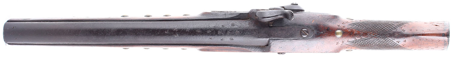 Indian ''Blanket Gun'', CAL: .69, MFG: early to mid 1800's, SN: NONE, Percussion Muzzleloader, 12 1/2'' barrel. According to the consignor, this example was originally cut down from a .69cal military flintlock musket, converted to percussion, then modified to it's current configuration. The checkered straight grip stock is very good & solid. There are numerous contusions, nicks & dings, with a good amount of asterisk embellishments in the stock. There are no visible markings on the gun. The metal components have fully toned to a brown patina, with consistent roughness throughout. Asterisk embellishments on the top of the barrel, same as the stock. Bore is poor, dark & rough. No sights. Brass tacks & buttplate. These nice early altered Indian Blanket Guns are becoming more scarce & truly embody the Indian Wars Era. 22'' OAL. Antique, No FFL Req. - Value: 1000 to 2000