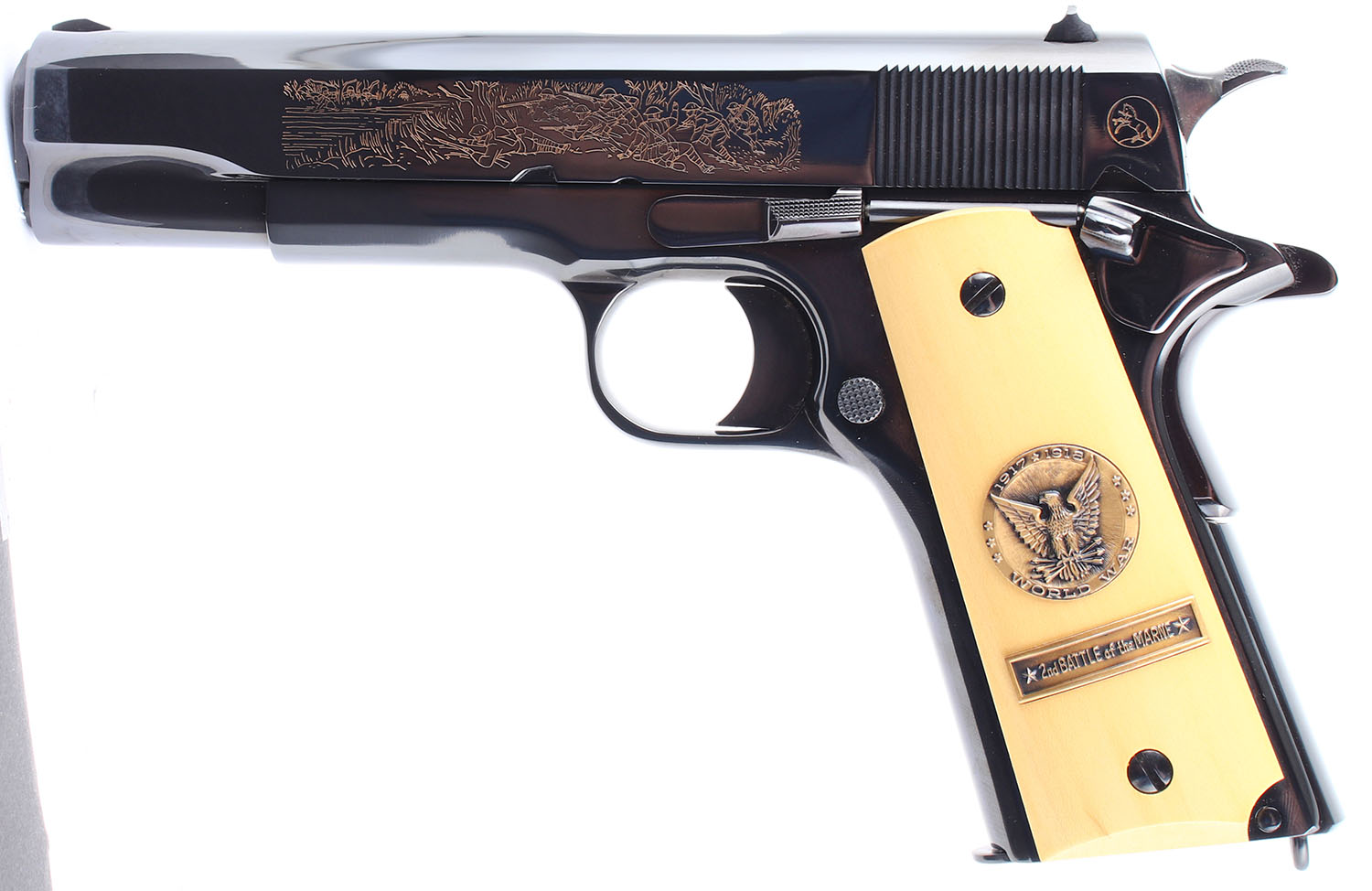 The WWII 1911 A1 pistols have wood grips with Colt medallions. They are nickeled and engraved. The engravings on the European Theatre 1911 A1 are as follows: ''Colt .45 Auto'' is engraved on the top of the barrel. The right side of the frame is engraved with the serial number, a Rampart Colt, and text reading ''Colt's PT. F. A. MFG. Co. Hartford Conn. U.S.A.''. The right side of the slide has engravings reading ''North Atlantic, Tunisia, Sicily, Ploesti, Salerno, Anzio, Normandy, Bastogne, Remagen, Berlin''. The left side of the slide has engravings that read ''World War II Commemorative European Theatre of Operations''. There are floral engravings on both the left and right side of the slide.