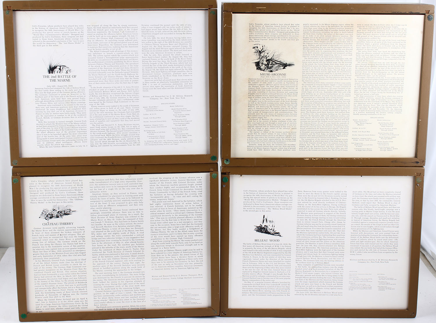 The WWI 1911's are mounted via brass hardware in light brown painted wood presentation cases with clear plexiglass windows. There are two particleboard segments set in grooves in each of the cases. Each case has a segment backing the pistol with a depiction similar to the engraving on the slide of that pistol as well as some text about the conflict commemorated by the pistol. The second particleboard segment is set in the back of each case, it is marked on both sides. One side has a sizable chunk of text about the conflict commemorated by the pistol, the other side has a map of the area where the conflict took place. The cases are all in good condition with some chips and scuffs in the paint and some small chips in the wood.