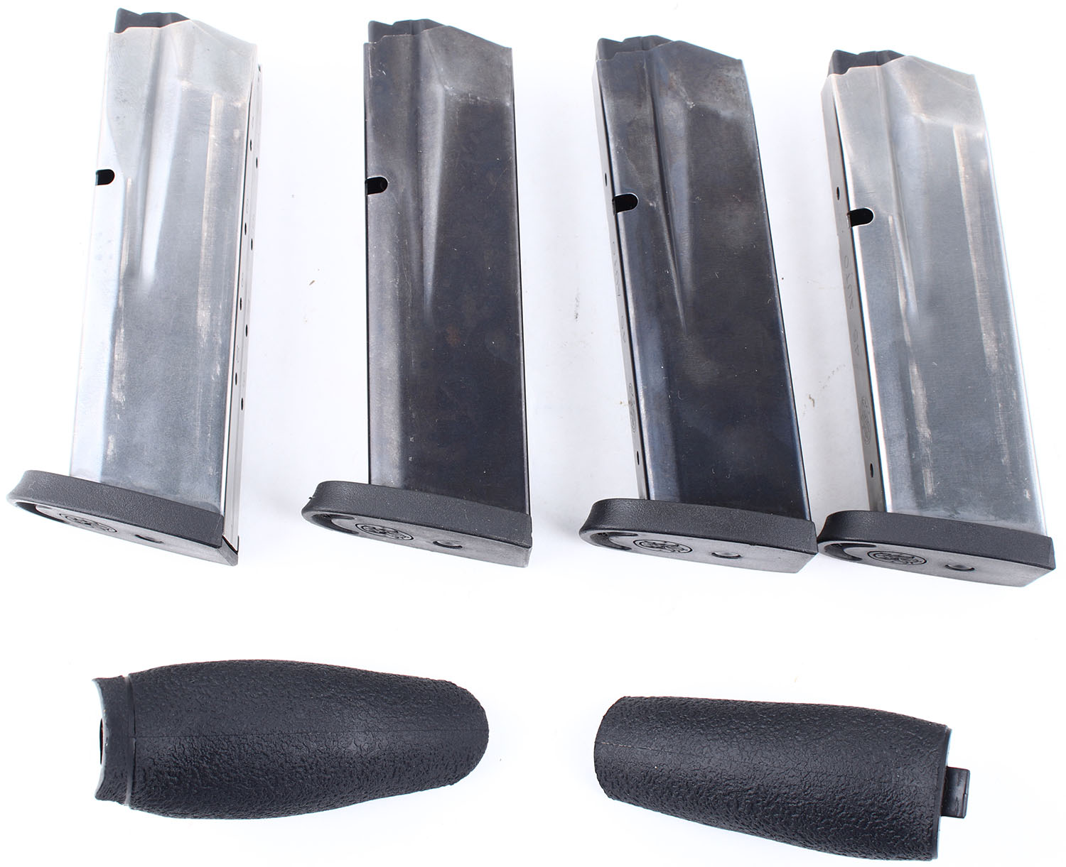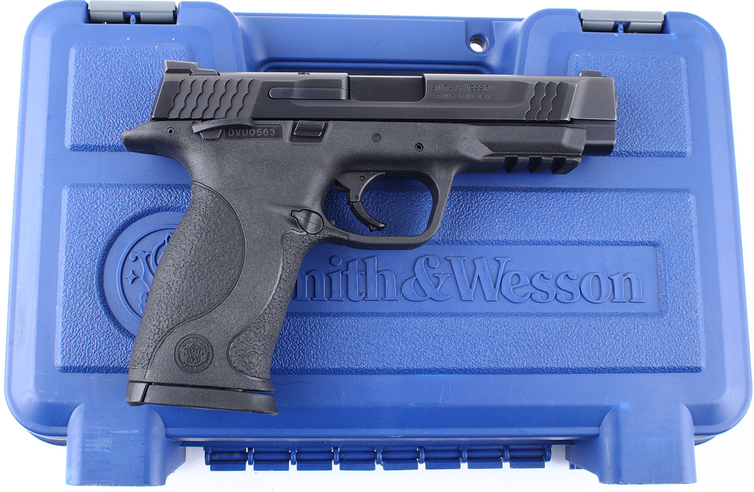 CASED Smith & Wesson, M&P45, CAL: 45 ACP, MFG: Modern, SN: DVU0563, Semi Auto Pistol. 4 1/2'' barrel. The textured plastic grip frame is in excellent condition with some wear. The black finish on the slide rates 99%. Bore is excellent. Mechanically solid with very little side to side play in the slide. 3 dot white combat sights, both front and rear sights are set into dovetail cuts, the rear sight has a set screw. Comes in a factory plastic hard case with five 10 round magazines, two extra back straps, and a lock. FFL Req. - Value: 300 to 500