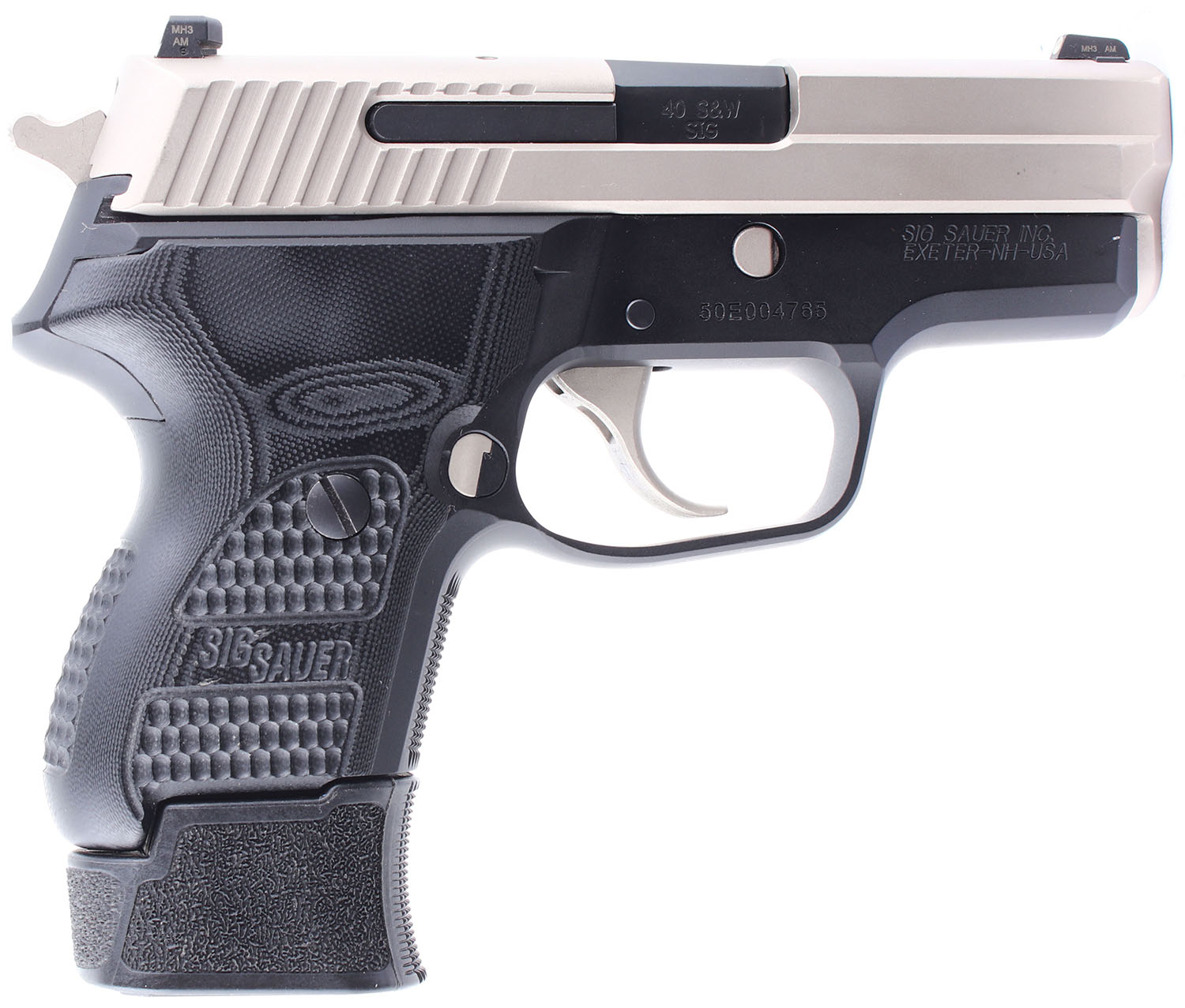 CASED Sig Sauer, P224, CAL: 40 SW, MFG: Modern, SN: 50E004765, Semi Auto Pistol. 3 1/4'' barrel. The textured plastic grips are in excellent condition with some wear. The black finish on frame rates 97%, and the stainless finish on the slide rates 94% with some wear including some scratches on the top of the slide in front of the rear sight. Bore is excellent. Mechanically solid with very little side to side play in the slide. 3 dot white combat sights, front and rear sights are set into dovetail cuts. Comes in the factory hard plastic case with a chamber flag, one ten round magazine, two extended 12 round magazines, and an owners manual. FFL Req. - Value: 500 to 1100