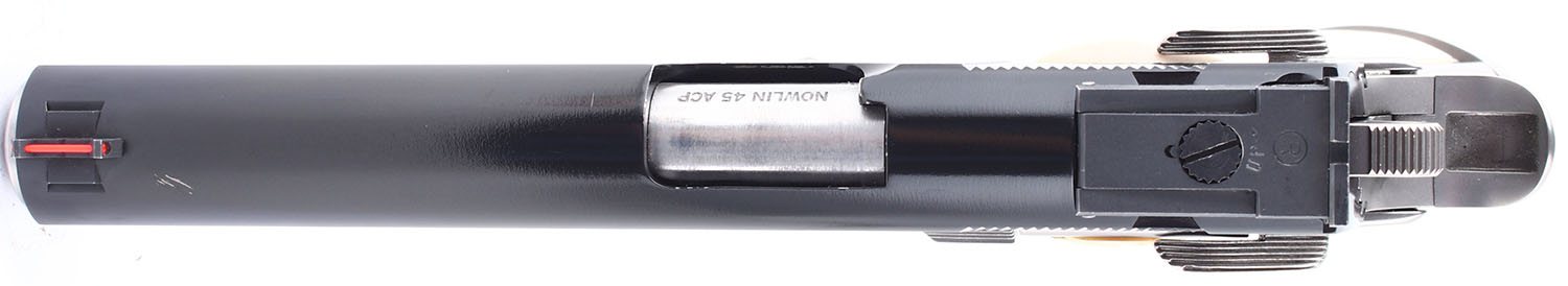 CASED Springfield Armory, Legend Series 1911 A1, CAL: 45 ACP, MFG: Modern, SN: RL 169, Semi Auto Pistol. 5'' barrel. The ivory grips are in excellent condition. The stainless finish on frame rates 99%, and the black finish on the slide rates 97% with some wear and small scratches. Bore is excellent. Mechanically excellent with no perceptible side to side play in the slide. Target sights set in dovetail cuts, blacked out windage and elevation adjustable rear sight, red fiber optic front sight. The gun comes with a Nowlin barrel installed (these barrels typically go for around $250), and aftermarket ivory grips marked on the inside ''Handcrafted for Colt Firearms'' (Ivory 1911 grips tend to go for approximately $500-$700). Comes in a S.A hard plastic case with one magazine, various alan keys and tools, a bore brush, and an owners manual and other related paperwork. FFL Req. - Value: 1500 to 2500