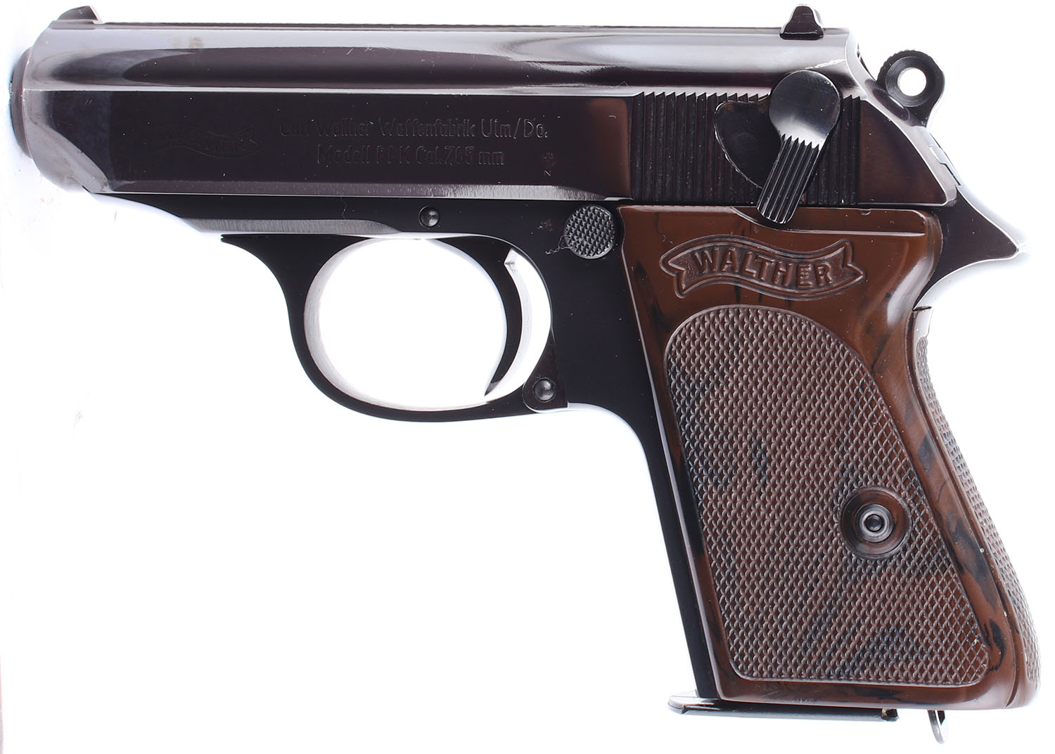 Walther, PPK, CAL: 7.65mm (32ACP), MFG:1967, SN: 219554, Semi Auto Pistol. 3 1/4'' barrel. The plastic grips are in excellent condition with some handling wear. Blued frame rates 97% with slight wear and little rust, the bluing on the slide has patinaed to a deep even plumb tone and rates 97% with slight wear. The barrel has several markings near the chamber including: 67 denoting the year of production, an antler proof mark, and an iron eagle. There is an iron eagle alongside the serial number on the right hand side of the frame, as well as one alongside markings on the left hand side of the slide. Bore is excellent. Mechanically solid with very little side to side play in the slide. The sights took on the same plumb color of the slide, front sight is integral to the slide, rear sight is set in a dovetail cut. Comes with two magazines in a generic soft pistol case. FFL or C&R Req. - Value: 800 to 1600