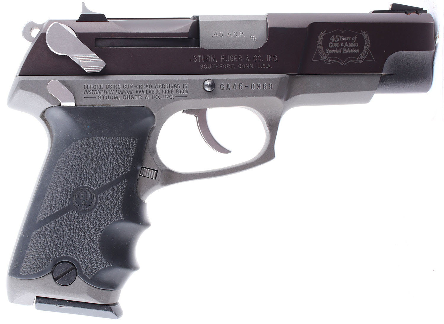 CASED Ruger, P90 (45 Years of Guns and Ammo Special Edition), CAL: 45 ACP MFG: Modern, SN: GS45-0369, Semi Auto Pistol. 4 1/2'' barrel. The rubber grip is in excellent condition. The frame rates 98% with light handling wear. The finish on the slide rates 97% with some wear. Bore is very good. Mechanically solid with some side to side play in the slide. 3 dot white combat sights, front sight is pinned to the slide and rear is set in a dovetail cut on the slide. Comes in the factory hard plastic case with four magazines and a safety pamphlet. FFL Req. - Value: 300 to 500