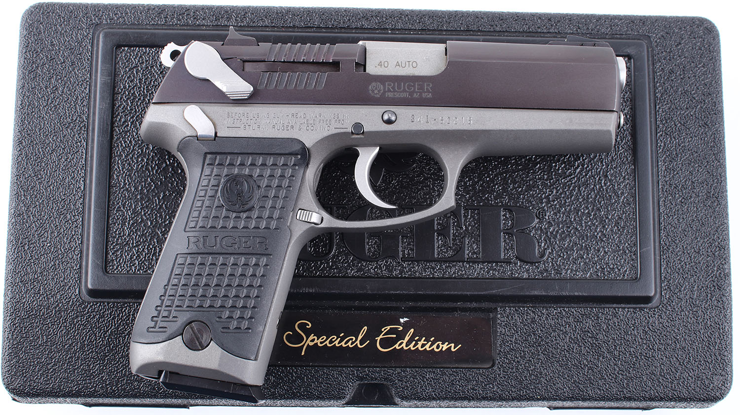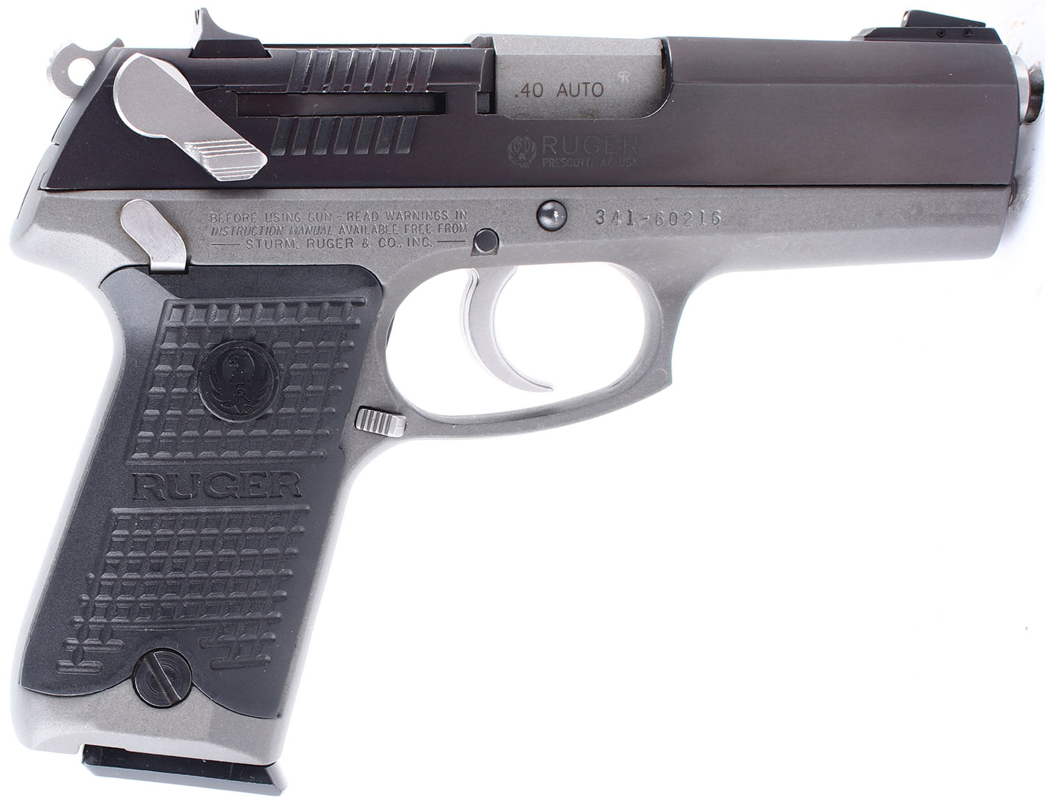 CASED Ruger, P94, CAL: 40 SW, MFG: 1994-2004, SN: 341-60216, Semi Auto Pistol. 4 1/4'' barrel. The plastic grips are in excellent condition. The frame and slide rate 99%. Bore is excellent. Mechanically solid with some side to side play in the slide. 3 dot white combat sights, front sight is pinned to the slide and rear is set in a dovetail cut on the slide. Comes in the factory hard plastic case, with three magazines, an owners manual, and other related paperwork. FFL Req. - Value: 250 to 500