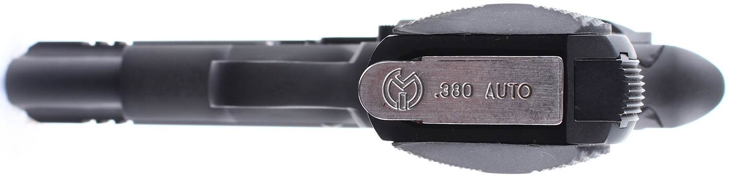 CASED Rock Island Armory (Philippines), M1911 A380 BBR, CAL: 380 ACP, MFG: Modern, SN: RIA 1968890, Semi Auto Pistol. 3 3/4'' barrel. Original checkered rubber grips are in excellent condition. The black finish on the frame and slide rates 98%. Bore is very good, slightly darkened. Mechanically solid with some side to side play in the slide. Blacked out sights, front sight is set into a dovetail cut and has red nail polish on it, black rear sight is set into a dovetail cut, it is slightly loose and can be pushed to either side. Comes in a factory hard plastic case with 5 magazines, a lock, inspection certificate and users manual. FFL Req. - Value: 250 to 400