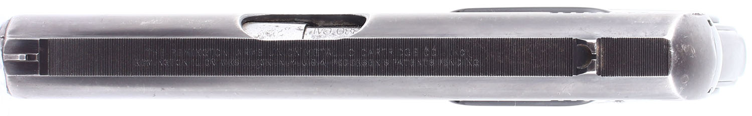Remington, Model: 51, CAL: 380 ACP, MFG: 1918-26, SN: PA5583, Semi Auto Pistol. 3 1/4'' barrel. The plastic grips are in very good condition with slight wear. The bluing on the frame rates 80%, while the bluing on the slide rates 75%, there is consistent handling wear throughout with some scratches and dings on the muzzle and end of the slide near the muzzle. Bore is good, slightly dark with some pitting and even roughness. Mechanically solid with very little side to side play in the slide. Rudimentary low profile pistol sights are integral to the slide. Comes in a modern reproduction box with one magazine, and a reprint registration card and pamphlet. FFL or C&R Req. - Value: 400 to 700