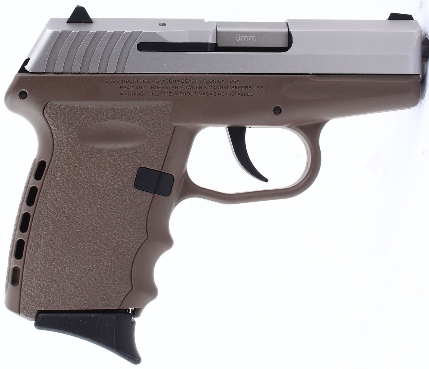 Sccy, CPX-2, CAL: 9x19mm, MFG: Modern, SN: 631828, Semi Auto Pistol, double action only. 3'' barrel. The FDE textured polymer frame is excellent. The metal gray finish on the slide is excellent, rating 99%. Bore is very good, with some roughness on the lands near the crown of the barrel. Mechanically solid. 3 dot white combat sights. One 10 round magazine included. FFL Req. - Value: 100 to 200