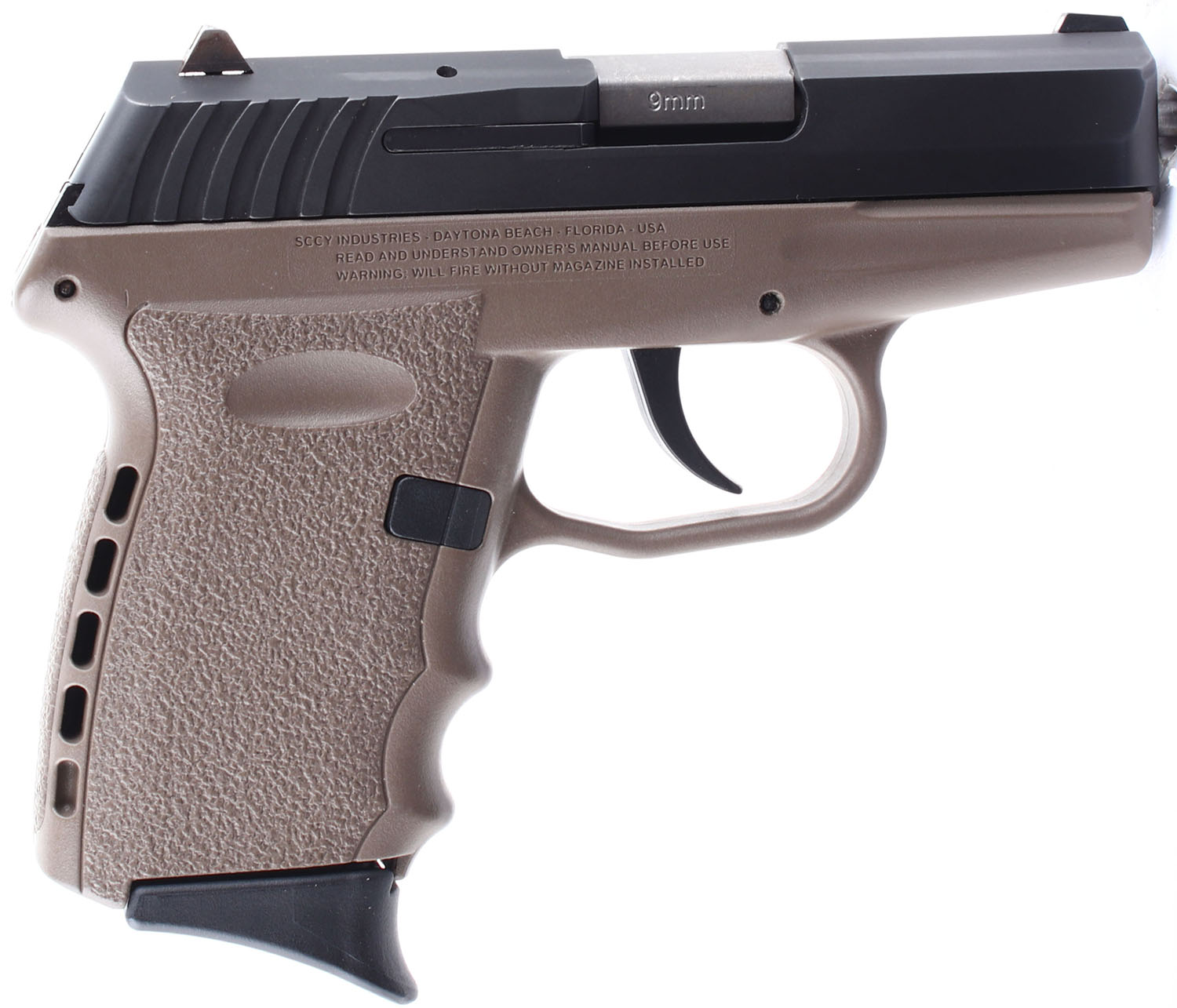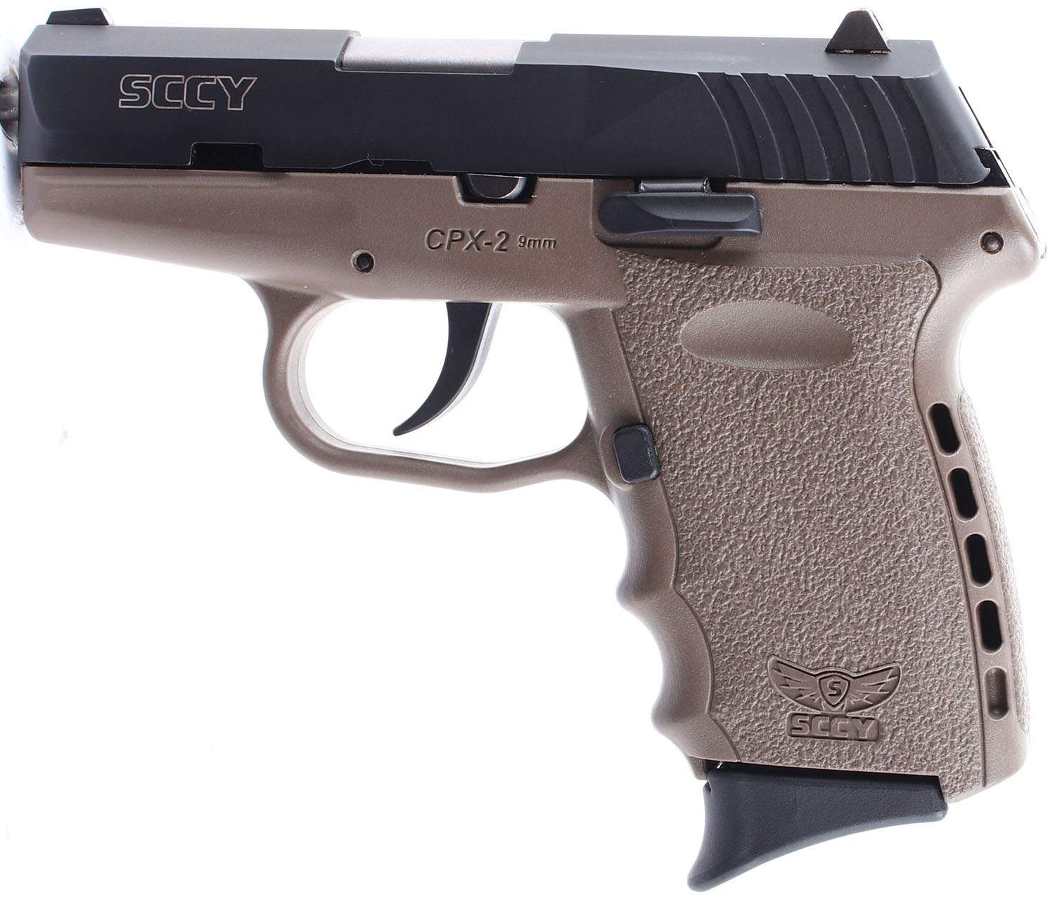 Sccy, CPX-2, CAL: 9x19mm, MFG: Modern, SN: 950434, Semi Auto Pistol, double action only. 3'' barrel. The FDE textured polymer frame is excellent. The black finish on the slide is excellent, rating 98%. Bore is excellent. Mechanically solid. 3 dot white combat sights. One 10 round magazine included. FFL Req. - Value: 100 to 200
