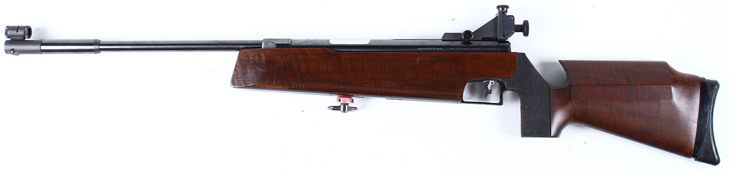 Feinwerkbau, Model 300 S Pellet, CAL: 4.5mm or .177, MFG: 1997, SN: 377364, Pump, 20'' barrel. Oberndorf Germany. Imported by Beeman. A high-quality, recoilless, sidelever, spring-piston air rifle, primarily designed for competitive 10-meter target shooting. It is known for its precision, reliability, & robust construction. The Model 300 S utilizes a unique system that cancel out recoil, making it ideal for precision shooting. The cheeked & textured vertical pistol grip target stock is excellent. The metal blue finish rates excellent. Bore is excellent. Fitted with a micrometer adjustable rear sight & silhouette front sight. Fully adjustable trigger. Stock is fitted with a solid recoil pad & accessory rail. Bore is excellent. The 300 S is a highly praised target rifle known for its recoil-reducing mechanism, accuracy, & construction quality, making it an excellent choice for competitive shooting & serious airgun enthusiasts. Overall excellent. No FFL Req. No FFL Req. - Value: 200 to 600