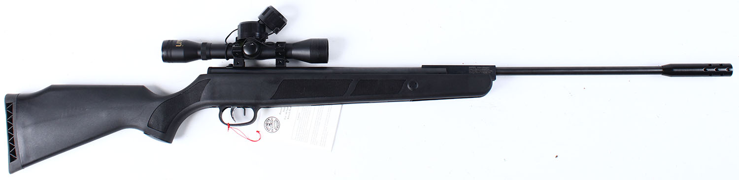 Beeman Precision, Model Sportsman RS2 Series Pellet, CAL: 4.5mm or .177, MFG: Modern, SN: NA, Break Barrel Pump, 20'' barrel. Promoted as accurate for up to 10-meter target shooting. The Model RS 2 advanced technology of the gas ram system uses compressed gas in a sealed, self-contained unit that is designed to replace the mainspring in a conventional air rifle. The air rifles cock like any other barrel-cocking airgun, but the single cocking stroke compresses a cylinder of gas instead of a mainspring. When the trigger is pulled, the compressed gas expands & drives the piston forward. The checkered & flat pistol grip, all-weather synthetic stock is excellent. The metal blue finish rates excellent. Bore is excellent. Fitted with a Beeman 4X32 scope. Stock is fitted with a ventilated recoil pad. Bore is excellent. Hang tag. Overall excellent. No FFL Req. - Value: 150 to 300