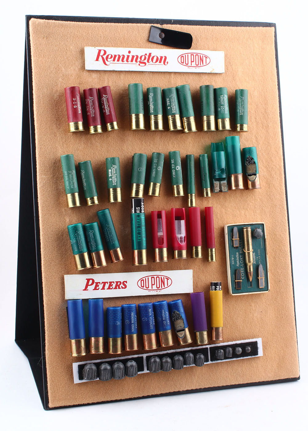 RARE! Remington/Peters/Du Pont Salesman Sample Briefcase. Made beginning in 1960, this is a Salesman's Sample Display all fitted in a luggage type case containing all the original dummy ammo as displayed in the pictures. This was used to set up in stores or vendor sales to display various Remington-Peters ammo offerings of the era. The case remains in amazingly great condition with all original contents intact. Case measures 21'' x 15 1/2'' x 5 1/2'' closed. Contents show a bit of scattered shelf soiling. This salesman briefcase has a variety of cartridges including, centerfire, rimfire, shotshells, window shells & bullets. It folds out to display each set individually, or as a whole. Some of the shotshell cartridges still have protective wrapping on them. This is the first time we have seen this set! Former RSA president Roy Marcot believes there was between 12 to 20 Remington field salesmen nationwide at the time & that its possible one was made for each salesman's use. This would likely limit total sets to 20 or less. The briefcase itself is in excellent condition, both inside & out. A wonderful opportunity to own such a rare & complete salesman sample set! * Grade: Excellent + - Value: 4000 to 6000