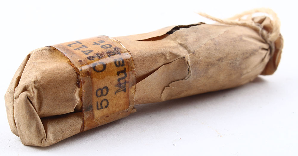 .58 Musket. Tan paper, Minie bullet, tied at top with folded tail. Tear in paper but still solid. Grade: Good - Value: 20 to 40