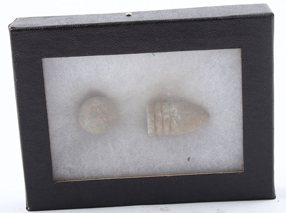 Lot of 2, Civil War battlefield bullets. One is a .65 in diameter roundball. The other is a 3 ring .565'' diameter rifled musket round. These are in a small display box with notation on the back that they were from the Wilson Creek battlefield in Missouri. Grade: Very Good - Value: 10 to 20