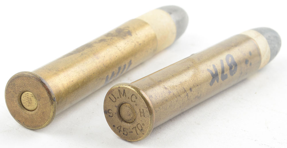 Lot of 2. 45-70 Sharps (2.1'' case). (1) HS:''U.M.C. H 45-70 S'', RN PP Lead. (1) NHS. FN PP Lead (cartridge is 60 grains heavier than the other listed). Grade: Excellent - Value: 40 to 80