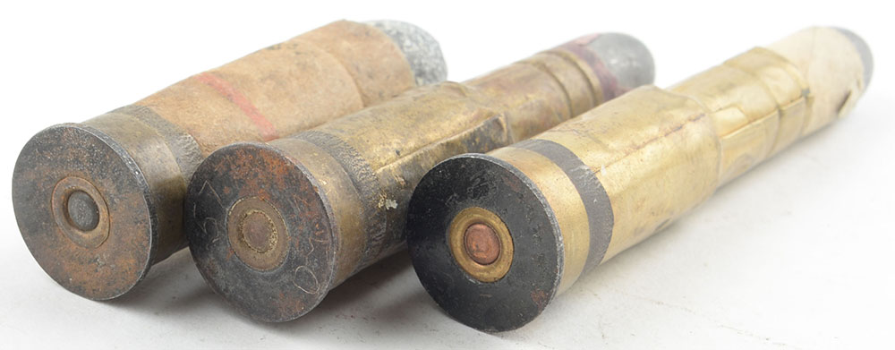 Lot of 3. British Military Cartridges. (2) 577-450 Martini Henry, NHS, RN PP Lead, One has cream paper and the other purple paper, Coil Cases. (1) 577 Snider, NHS, RN Lead, red stripe around case. Grade: Good + - Value: 30 to 60