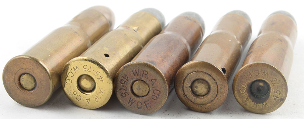 Lot of 5, 45-75 WCF. DUMMIES, 1 WRACO board dummy, 1 no h/s board dummy made by WRACO, 1 no h/s function dummy, FMJFN tinned jacket made by WIN, 1 no h/s 2 holes function dummy, 1, PRESSURE TEST CARTRIDGE, W.R.A.Co. 45-75 W.C.F, struck primer with blow back residue, 1 hold in case .150 dia. With blow back residue around hole. Grade: Excellent - Value: 80 to 160