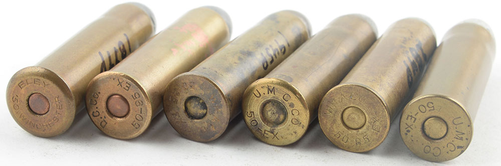 Lot of 6, 50-956 EX., (2) W.R.A.Co. 50-95 EX, (1) Express, (1) FMJFN, (2) U.M.C.CO 50-EX., (1) Express, (1) LDFN, (1) D.C.Co. 50-95 EX, Express bullet, (1) Eley 50. Winchester, Express Bullet. Grade: Excellent - Value: 100 to 200