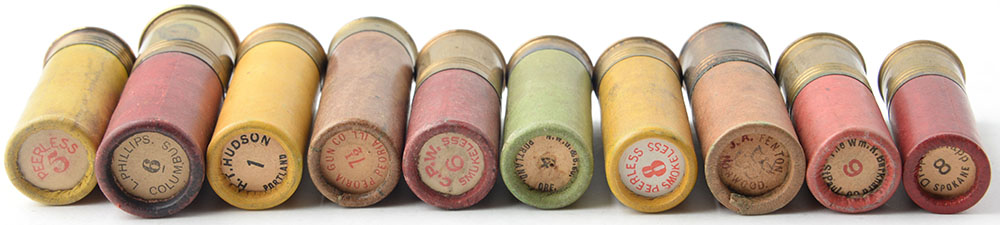 | Lot of 10 paper shotshells with rare mixed top wads. Grade: Exc...