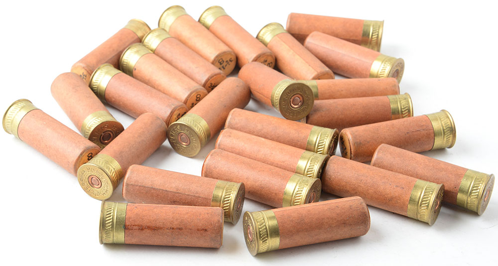 Large lot of loaded tan paper, Peters Victor 12ga, 2 5/16'' OAL. Grade: Excellent - Value: 10 to 80
